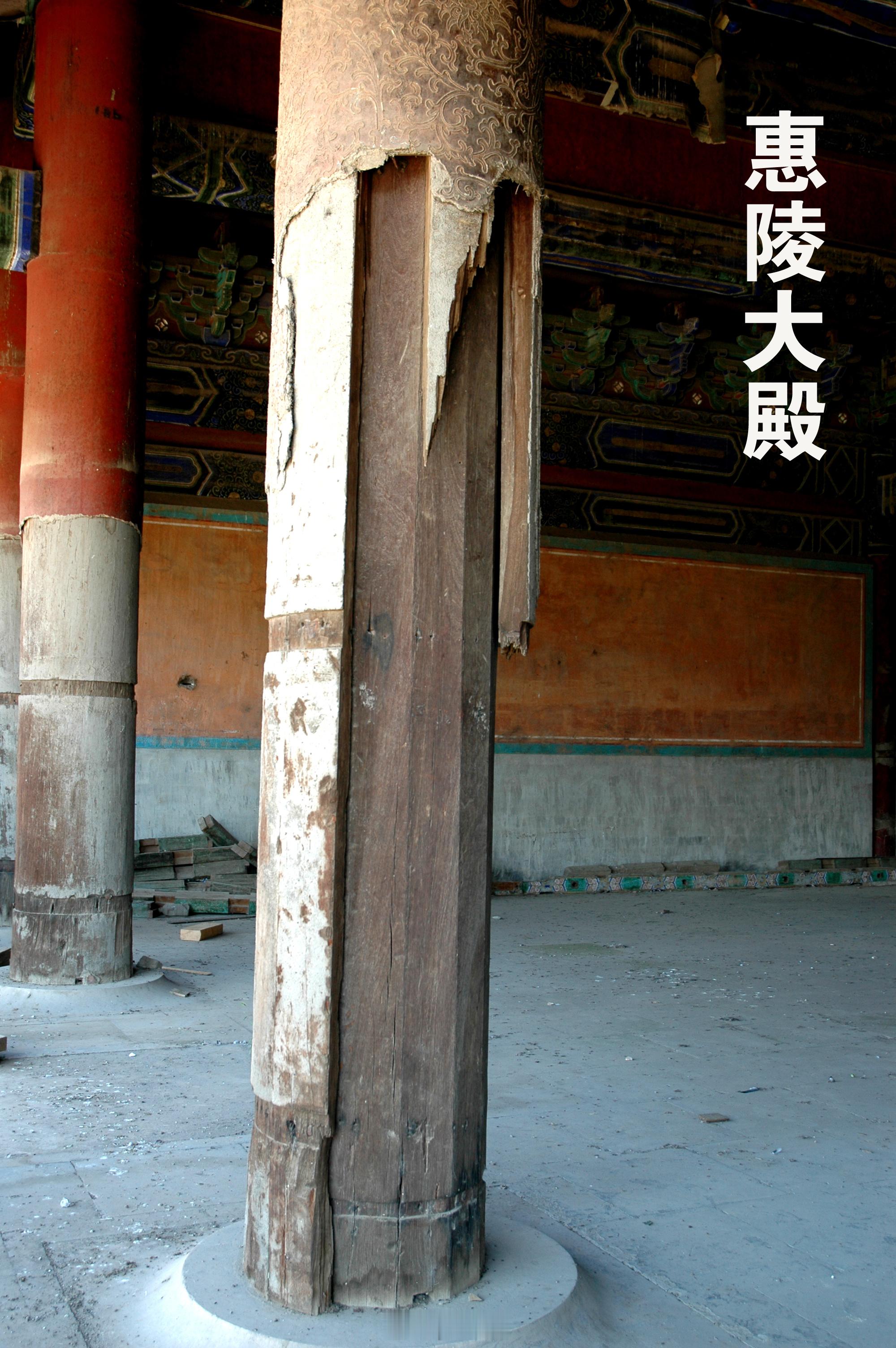 在中国古建筑的柱子中,有一种“包镶柱”,这种柱子不是用一根独木做成的,而是“拼接”起来的。具体地说,就是因为找不到又长又粗的木料,为了解决粗度不足的问题,于是就采取“拼接”的方法。先找到一根高度够,但较细一些的木料,当作柱子的芯儿,多做成八棱形,称之为“心柱”。然后再用多块木块将“心柱”包镶起来,以达到需要的柱子直径。最后再用多道铁箍紧紧固定,钉以铁钉。用这样的方法做的柱子就叫“包镶柱”。由于柱子表层要披麻挂灰做地仗上油漆,所以柱子是否是包镶柱表面难以看出。 明十三陵的长陵大殿虽然规模宏大,其柱子却都是独根的,不是“包镶柱”。 清东陵已知采用“包镶柱”的有慈禧陵隆恩殿。昭西陵、景陵、惠陵隆恩殿有包镶柱,但是不是全部都是尚不清楚。顺治帝的孝陵隆恩殿的柱子已发现有相当数量的柱子是独根的,但不敢说都是独根的。 由于慈禧陵大殿的柱子不彩画,外露黄花木原木本色,所以柱子用两种箍。里层用铁箍,用铁钉。外面的是铜箍,用铜钉。外层的铜箍稍宽于铁箍,这样可以将铁箍完全遮盖上。 用被砍坏的昭西陵、惠陵隆恩殿的柱子可以看到包镶的“柱心”。