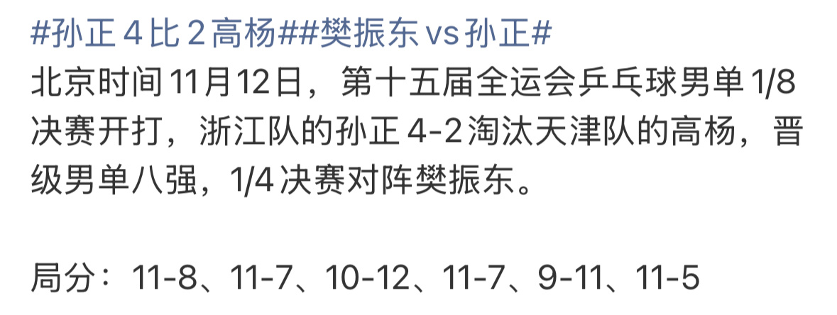 还有谁不知道参加过张继科张指导集训的孙正进了全运会乒乓球男单八强呢!不知道我再说