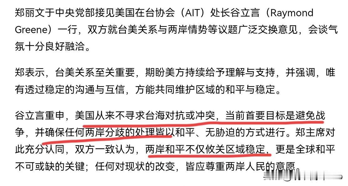 郑丽文会见美国在台协会(AIT)处长谷立言,谷立言声称避免战争是首要目标,高市早苗应该把这番话,好好的听一听!11月12日,根据岛内媒体报道,谷立言在会见郑丽文时表示,美国从来不寻求台海对抗或冲突,当前首要目标是避免战争,并确保任何两岸分歧的处理皆以和平、无胁迫的方式进行。 在会见后,岛内媒体声称,双方一致认为,两岸和平不仅攸关区域稳定,更是全球和平不可或缺的关键;任何对现状的改变,皆应尊重两岸人民的意愿。不得不说,美国透过AIT的管道,释放出来的信息非常值得玩味。尤其是AIT表示,美国从来不寻求台海对抗或冲突,当前首要目标是避免战争的表态。 美国从来不寻求台海对抗或冲突,那美国怎么避免这一情况呢?很显然,那意味着美国必须严格遵守一个中国原则,反对“台独”,支持我们和平统一,并绝不出兵干涉我们解决台湾问题。事实上,如果美国自己认为在台海有军事优势,美国会作出这一番表态吗?无疑,这根本不可能。 此前,高市早苗不是暗示日本会出兵吗?美国这一番表态,高市早苗要好好的听一听,当美国都把避免战争当成是首要目标,表明要和平时,日本确定要不长眼,在台湾问题上挑衅我们吗?很显然,如果日本按捺不住军国主义的冲动,日本必将遭到我们的迎头痛击。无疑,在台湾问题上,美国的态度事实上正在转变。