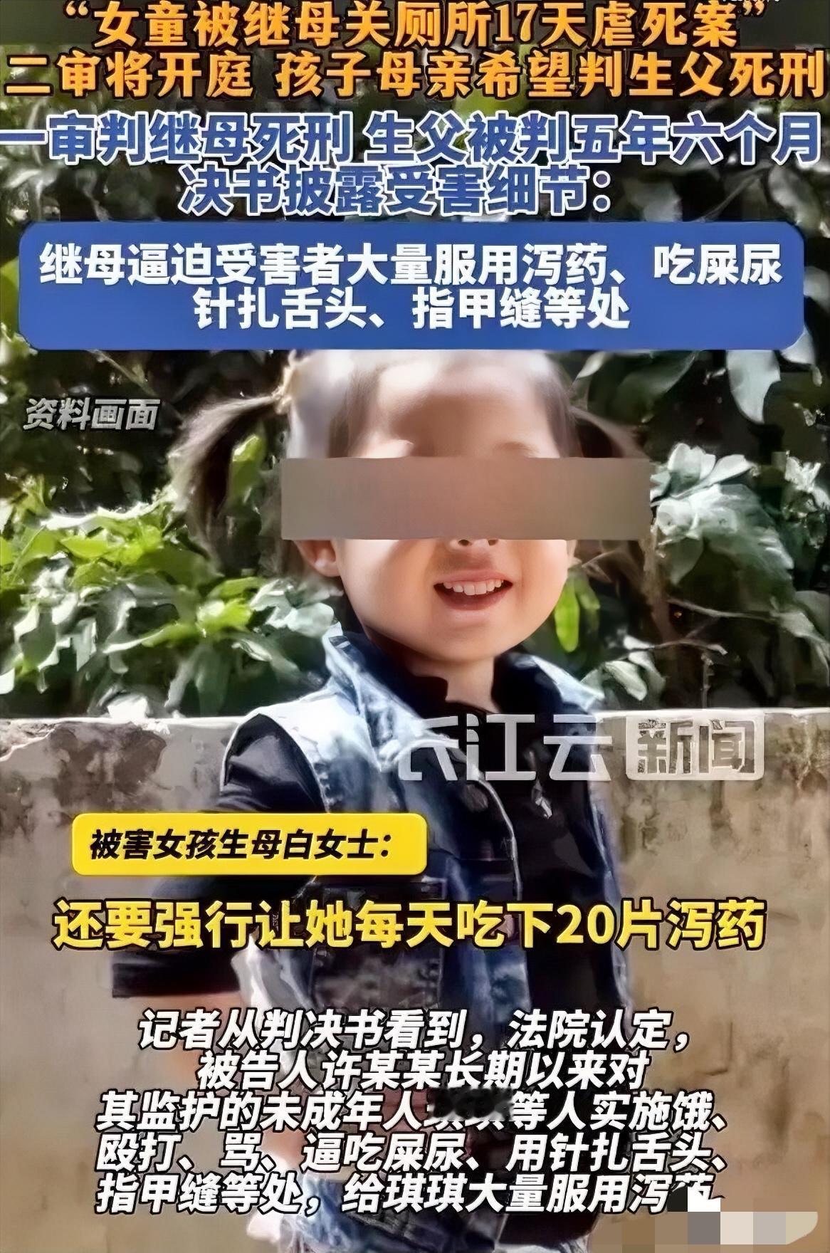 继母维持原判!可看完真相,更让人恨得牙痒痒的是那个“禽兽不如”的生父! 都说虎毒不食子,这个父亲却亲手把女儿推向地狱。继母灌她排泄物、用针扎、开水烫,他不仅不阻拦,还网购1600片泻药,每天逼孩子灌20片。2023年12月,继母把女孩捆在卫生间17天,甚至发照片给他,他依旧无动于衷,直到孩子瘦到只剩40斤,带着满身伤痕离世。 继母的蛇蝎心肠让人发指,但生父的冷漠与帮凶行为,才是压垮孩子的最后一根稻草。他不是帮凶,而是真正的主谋——没有他的纵容,继母怎敢如此肆无忌惮? 可最终,这个亲手摧毁女儿的生父只判了5年6个月,这样的判决实在太轻!对孩子的伤害是致命且不可逆的,为人父母的底线被他彻底践踏。法律是正义的底线,但这样的结果,真的能告慰孩子的在天之灵吗?愿每个孩子都能被世界温柔以待,更愿“生而不养、养而不护”的父母,能受到应有的严惩!