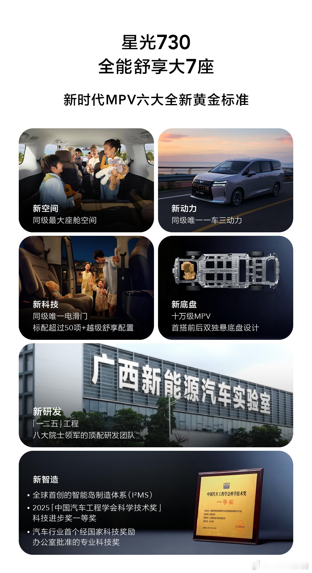 星光730正式上市:7.3万元起今日,「全能舒享大7座」星光730正式上市,一门开万家,为千万中国家庭开启万种幸福可能。新车共推出四款车型配置:燃油1.5T 6MT舒适型、燃油1.5T CVT精英型、插混125km豪华型、纯电500km豪华型,上市指导价分别为7.30万元、8.38万元、10.38万元、10.98万元,更有置换补贴价7.10万元-10.58万元起。车身尺寸方面,长宽高分别为4910mm×1850mm×1770mm,轴距达2910mm,内部有效车长3331mm,横向宽体设计1500mm 。内饰方面,提供暖沙棕、胡桃棕两套内饰配色,暖沙棕明亮温馨,胡桃棕耐看耐脏,适配不同审美需求。标配双侧重力滑轨滑移门(高配为右侧电动滑移门),便捷上下车;部分版本搭载超纤皮包覆多功能方向盘、电子式怀挡、12.8英寸中控屏 。燃油版:搭载1.5T发动机,最大功率130kW,6MT版本最大扭矩260N·m,CVT版本高达290N·m,满载动力充沛,适配创富与家用场景 。插混版:搭载1.5L发动机+电机组合,匹配灵犀动力3.0技术,发动机热效率43.2%,CLTC纯电续航125km,综合续航1100km,亏电油耗仅5.3L/100km 。纯电版:配备60kW·h神炼电池,CLTC续航500km,电耗13.6kW·h/100km,每公里成本仅7分钱;支持2C快充,30%-80%补能仅20分钟,还可外放电满足露营需求 。