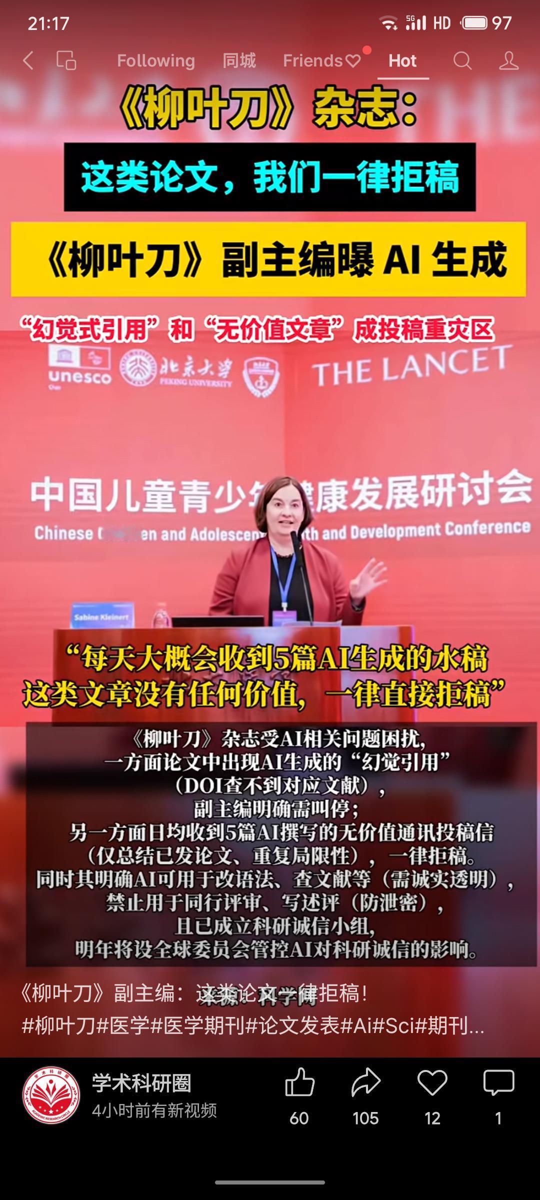 《柳叶刀》副主编指出,目前遇到大量AI生成的投稿,存在“幻觉引用”和无价值内容,日均收到约5篇此类稿件,均直接拒稿。该刊允许在方法等部分有限使用AI,但严禁用于同行评审,并已成立小组应对AI对科研诚信的冲击。