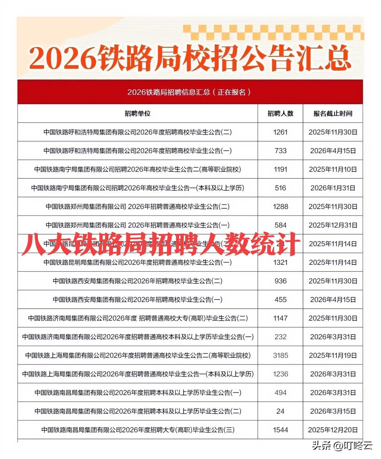 中国铁路8大局招聘人数统计,正在报名中,赶快收藏!速速投递简历报名!呼和浩特铁路局、郑州铁路局、南昌铁路局、济南铁路局、上海铁路局、西安铁路局、昆明铁路局等,大专高职毕业生可以报名!报名窗口快来围观揭秘详细内容![点亮平安灯][点亮平安灯][来看我][来看我][礼物][礼物] 铁路公招