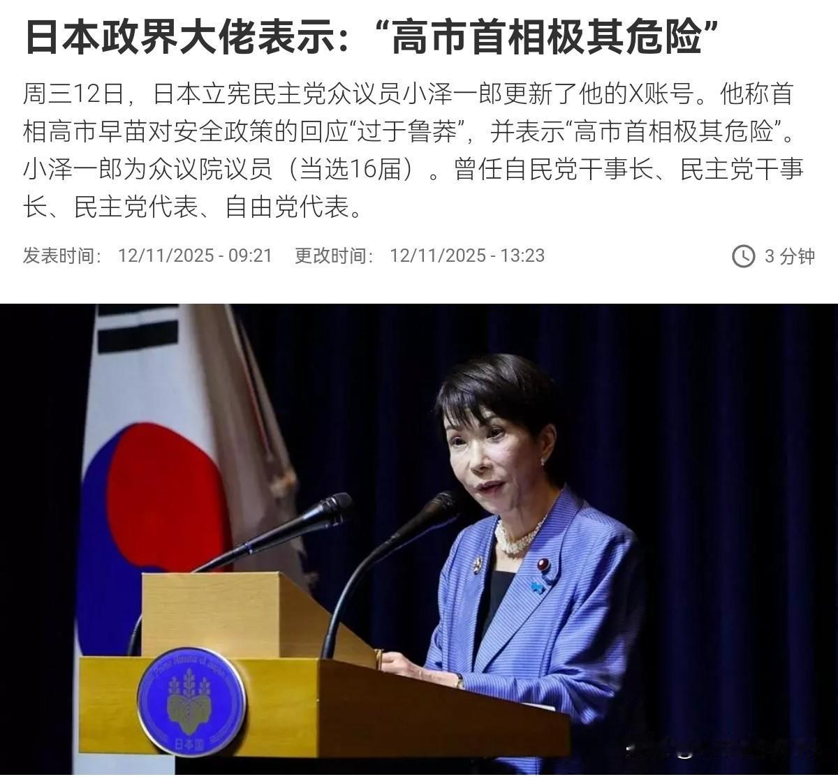 日本政界还是有明白人!日本政界大佬点名批评高市早苗,极其危险,非常的鲁莽!11月12日,根据法新社报道,日本立宪民主党众议员小泽一郎表示,首相高市早苗对安全政策的回应过于鲁莽,涉及国家安全保障,也就是关乎国民生命与国家命运的问题,她的态度太过轻率。 政治家随意煽动对外危机、点燃火种,导致许多人情绪化反应,火势不断扩大,等到察觉时已经无法扑灭,真正意义上的“存立危机事态”就此发生,最终让国民付出巨大牺牲。这样的历史案例数不胜数。正因如此,外交与政治必须始终保持冷静。很显然,在高市早苗捅了大篓子之后,日本政坛终于出现了有分量的,公开批评高市早苗的声音。 作为日本政坛当了16届众议院议员,且曾任自民党干事长、民主党干事长、民主党代表、自由党代表等职务的小泽一郎,无疑非常清楚高市早苗的言论,所引发的严重事态。说句不客气的,优秀的政治家都是能够处理纠纷,化解矛盾,造福人民的人物,而只有政客才热衷于制造危机,激化矛盾,而全然不管国家和人民的根本利益,高市早苗的作为无疑就属于后者。 很显然,小泽一郎的表态,这就是一剂清醒剂,这有助于给高市早苗发热的头脑降降温,也有助于将日本政坛那种甚嚣尘上,歇斯底里的非理性情绪回归到理性状态。高市早苗在台湾问题上的表态,事实上就是在动摇中日关系的基础,一步踏错有可能引发不可测的中日战争。很显然,日本政坛还是有明白人,还是有人知道高市早苗干了错事,在重大问题上严重缺乏头脑。