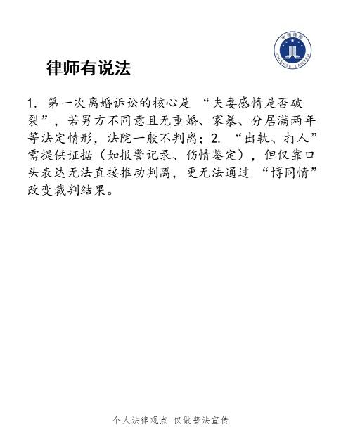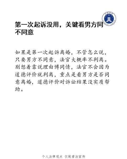 如果是第一次起诉离婚,不管怎么说,只要男方不同意,法官大概率不判离。别想着靠说理由博同情,法官不会因为道德评价就判离,重点是看男方是否同意离婚,道德评价对诉讼结果没实质帮助。