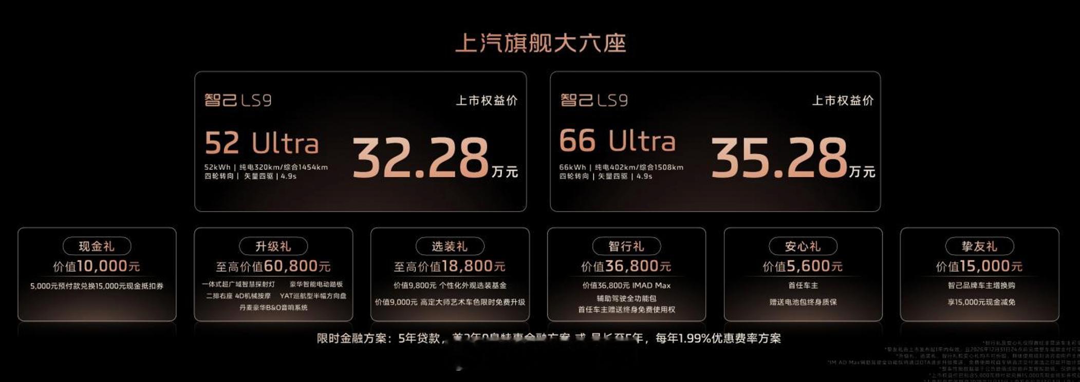 智己LS9,32.28万元起,价格有点霸气。在已有的5000台大定中,我的长途群里至少贡献了两台,其中一台就是最近有点出名的陈大状陈律。有些朋友对这款能洗澡、有地暖的车还不了解,简单介绍一下配置:- 动力系统:全系标配800V架构+恒星超级增程,综合续航1508km,纯电续航402km。-操控底盘:灵蜥数字底盘3.0,双向24°四轮转向+双腔空气悬架,比小车还灵活。- 智能驾驶:520线激光雷达+英伟达Thor芯片,IM AD Max系统支持手势识别、AEB/AES紧急避让。- 舒适豪华:全车零重力座椅+4D机械按摩+智控地暖系统+B&O音响。