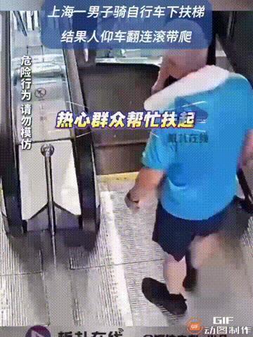 上海一处商场内,一名男子骑着自行车下扶梯,他以为自己可以安然无恙,谁料这是阶梯式扶梯,而不是直梯,结果导致他连人带车摔了个四脚朝天,之后周围的群众见状,连忙过来将他扶起,所幸摔得并不严重,网友看完这段视频,都觉得这名男子真是太离谱了,一般来说,自行车都是不允许进入商场的,而他不仅骑着自行车进入,还在乘坐阶梯式电梯时,自信满满地坐在位置上,如果他可以下来推着自行车,恐怕也不会摔倒了,因此造成这样的结果,也是他盲目自信以及疏忽大意的原因,相信经此一役,他也能吸取教训了。大家怎么看呢?