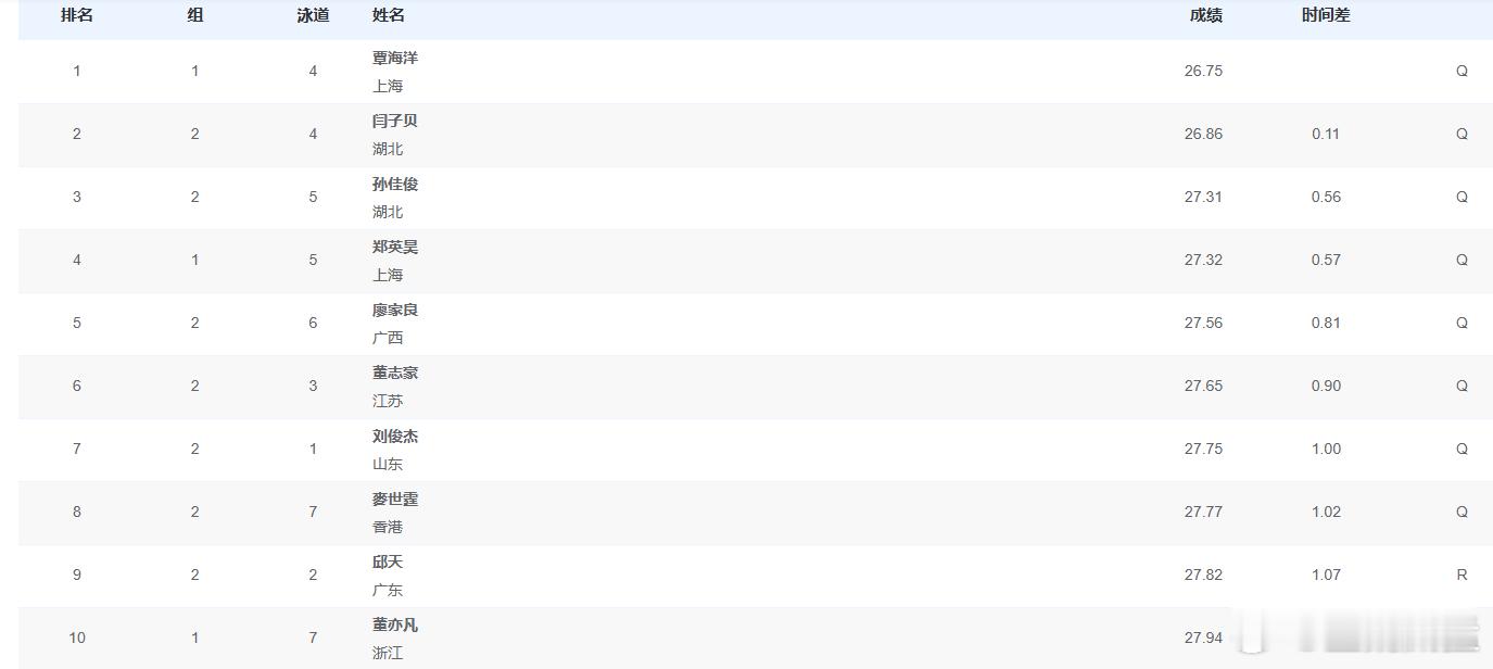 全运男50蛙半决赛覃海洋无意外第一 湖北老将平六年前自己创造的亚洲纪录惊喜重回巅峰11月12日晚,2025年全运会游泳大项结束了男子50米蛙泳半决赛,现亚洲纪录保持者、上海选手覃海洋以26秒75获得第一。覃海洋在预赛里放轻松,结果输给湖北老将闫子贝。半决赛第一组覃海洋拿出九成功力,以26秒75稳得总第一。闫子贝在半决赛里继续给出亮眼表现,他在第二组游出26秒86,正好和他2019年世锦赛打破亚洲纪录获得第四名时的成绩一样,而当时也是闫子贝的巅峰时期。覃海洋在今年世锦赛半决赛上,游出26秒52的年度最高战绩,和他26秒20的亚洲纪录还有段距离。但放眼国内,26秒7左右就已经笃定夺冠。闫子贝要完成对当下覃海洋的超越,并不现实。但作为30岁老将,职业末期能再次回到个人巅峰,足以让人赞叹不已。