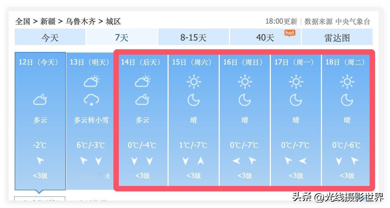 11月14日,我要去新疆乌鲁木齐晒太阳,顺便看看风景,感受少数民族风情和风味,感受新疆的经济产业建设的蓬勃发展新态势。超级计算机认为,11月14日到18日,乌鲁木齐的天气非常好,是正经的冬天,但是,每天都有大太阳,很安逸! 其实,北方的冬天,白天气温只要不低于0度,只要有阳光,其实都是蛮舒服的! 嗯,就是下半夜和凌晨天亮的时候,稍微有一点点冻!还好还好啦! 这么好的天气,重庆飞乌鲁木齐,想要看到天山雪山,该坐飞机的哪一边呢?! 有没有好心人悄悄咪咪告诉我一下啊?!