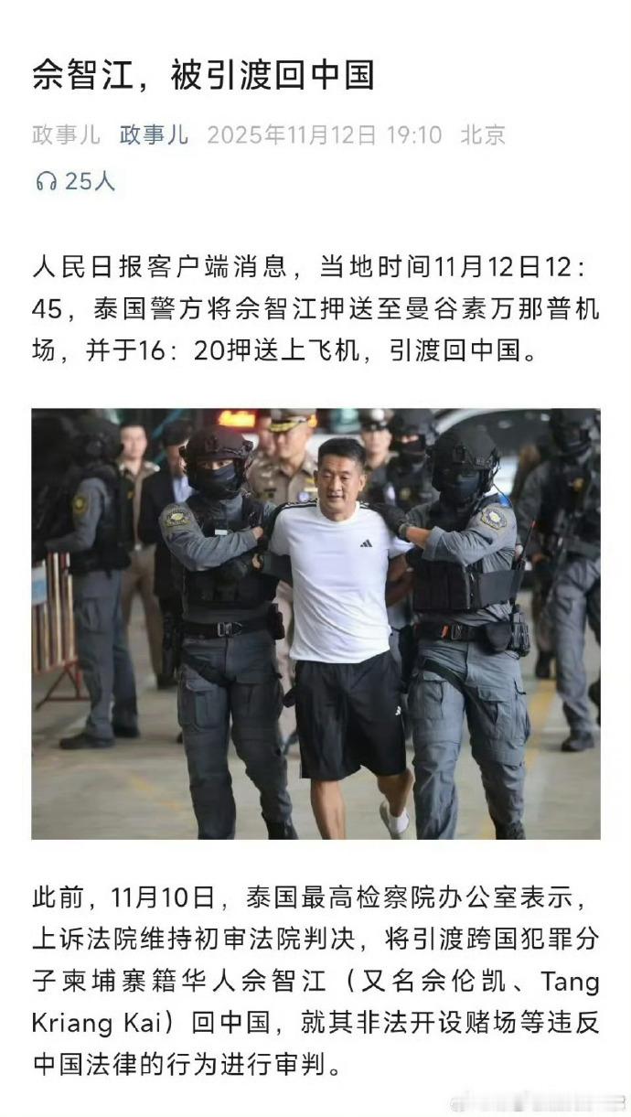 缅甸妙瓦底的亚太新城园区的所有者佘智江,2022年8月在曼谷被泰国警方逮捕,2025年11月12日被引渡回中国。