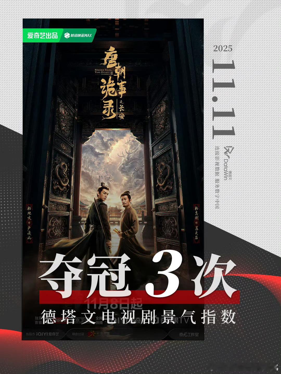 2025年11月11日德塔文电视剧景气指数新鲜出炉,唐朝诡事录之长安景气指数1.770登顶TOP1,已经夺冠 3 次 ,杨旭文饰演的卢凌风角色占比45%