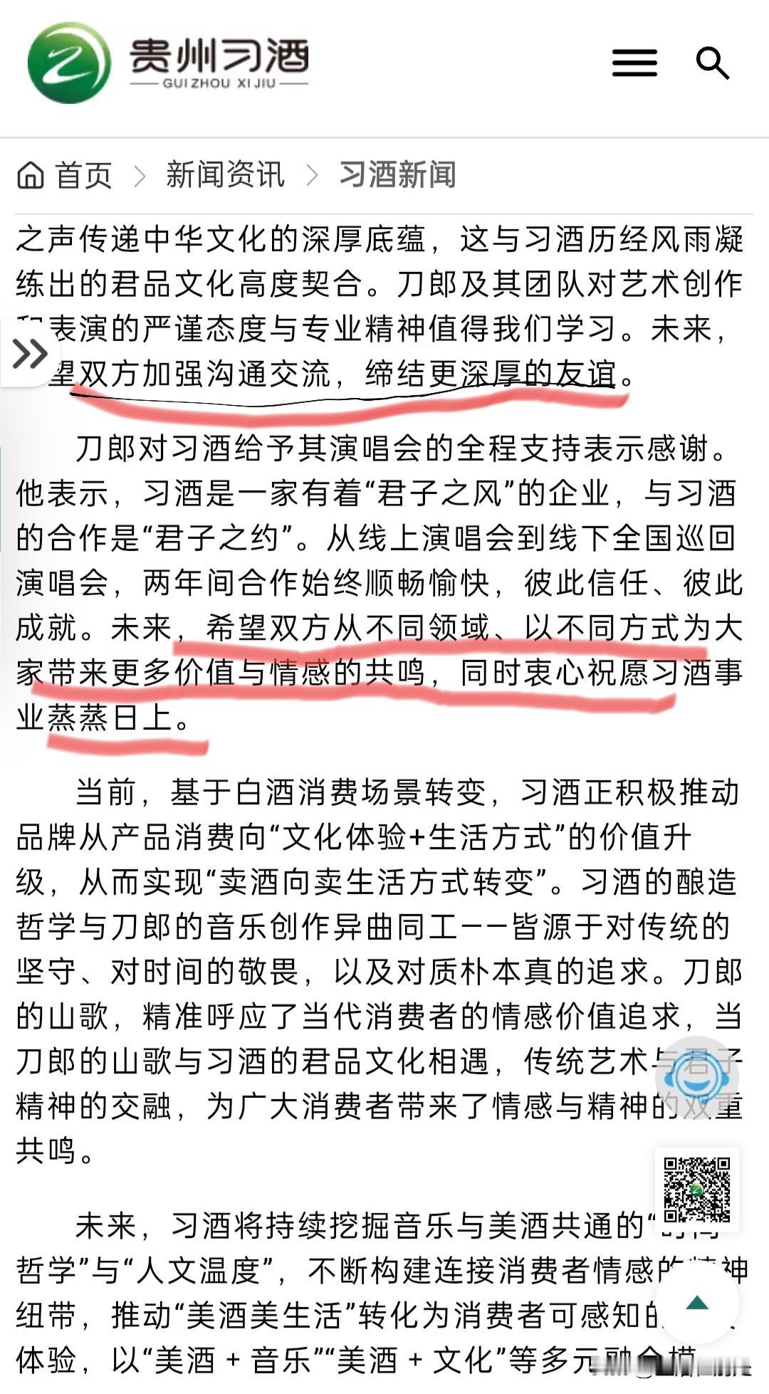 刀郎团队到访贵州习酒总部的几个细节: 一、刀郎非常低调,11月10日就带着团队悄悄到贵州探访习酒总部,感恩2年来的愉快合作。网上没有任何风声消息,2天后,11月12日习酒集团官网才发布消息。 二、着装细节改变。抵达时,刀郎还是短袖套黑色羽绒马甲,在与习酒集团领导座谈时,换了件长袖。 三、刀郎感谢习酒的支持,称两年间合作始终顺畅愉快,彼此信任、彼此成就。 四、对于未来,刀郎说希望双方从不同领域、以不同方式为大家带来更多价值与情感的共鸣。 五、最后,刀郎表达了祝愿,衷心祝愿习酒事业蒸蒸日上。