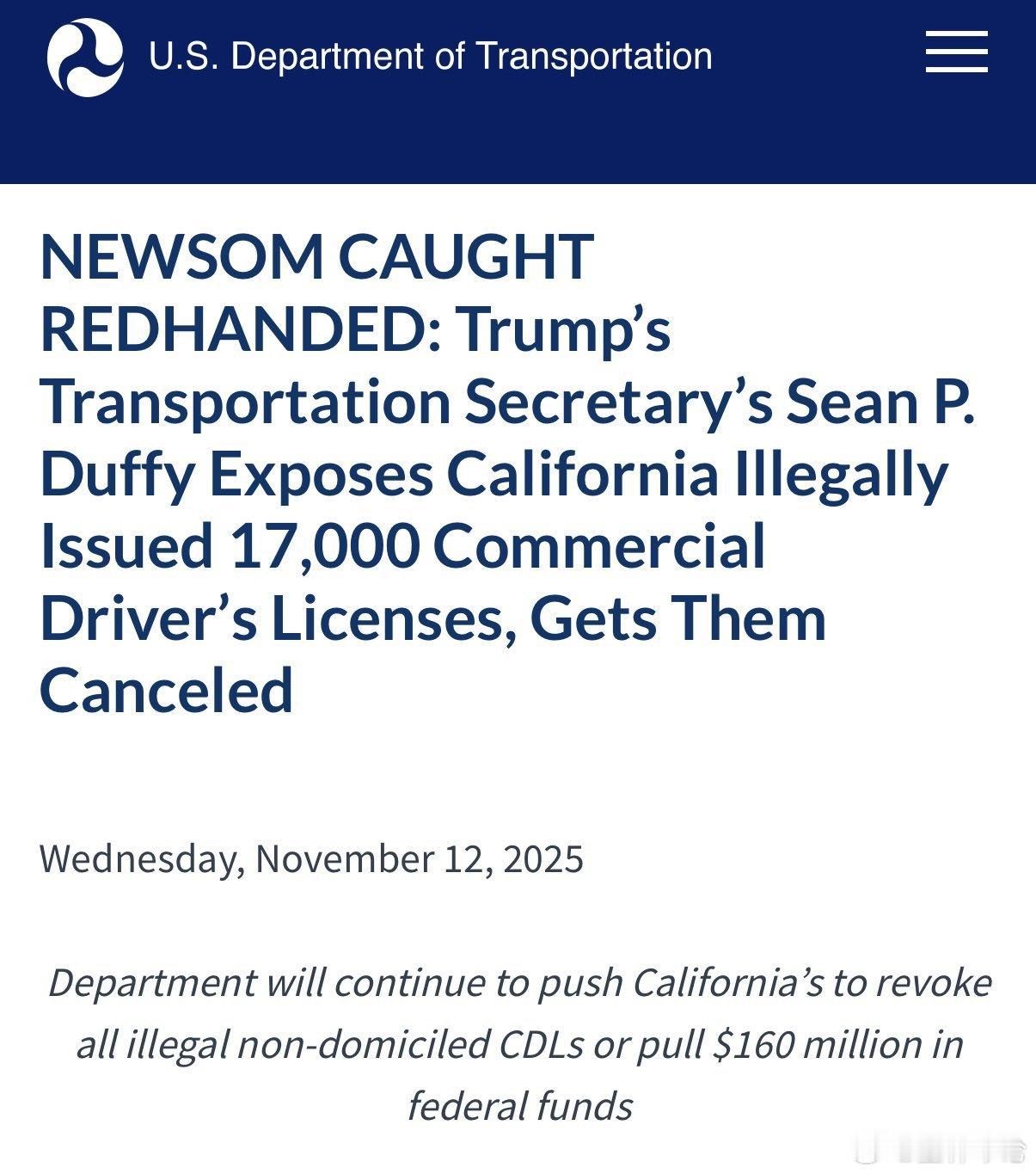 🚨突发新闻加州确认非法向“外国司机”发放了 1.7万 张非本州居民的商业驾驶执照。交通部长 肖恩·达菲 表示:民主党人向不会说英语、也不懂我们道路标志的外国人发放了商业驾驶执照,现在这些人驾驶着大型卡车在我们的道路上行驶。⚠️交通部将全部撤销这些驾照!