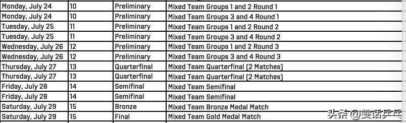 根据2028洛杉矶奥运会乒乓球总赛程表的具体轮次安排,奥运会混团应当是将16支队伍分为4组,每组4支队伍,每支队伍进行3轮小组赛。小组排名前2的队伍晋级8强,8支队伍进行8强淘汰赛。 ​​​