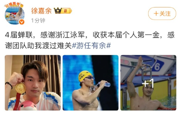11月12日晚间,徐嘉余发文:4届蝉联,感谢浙江泳军,收获本届个人第一金,感谢团队助我渡过难关。