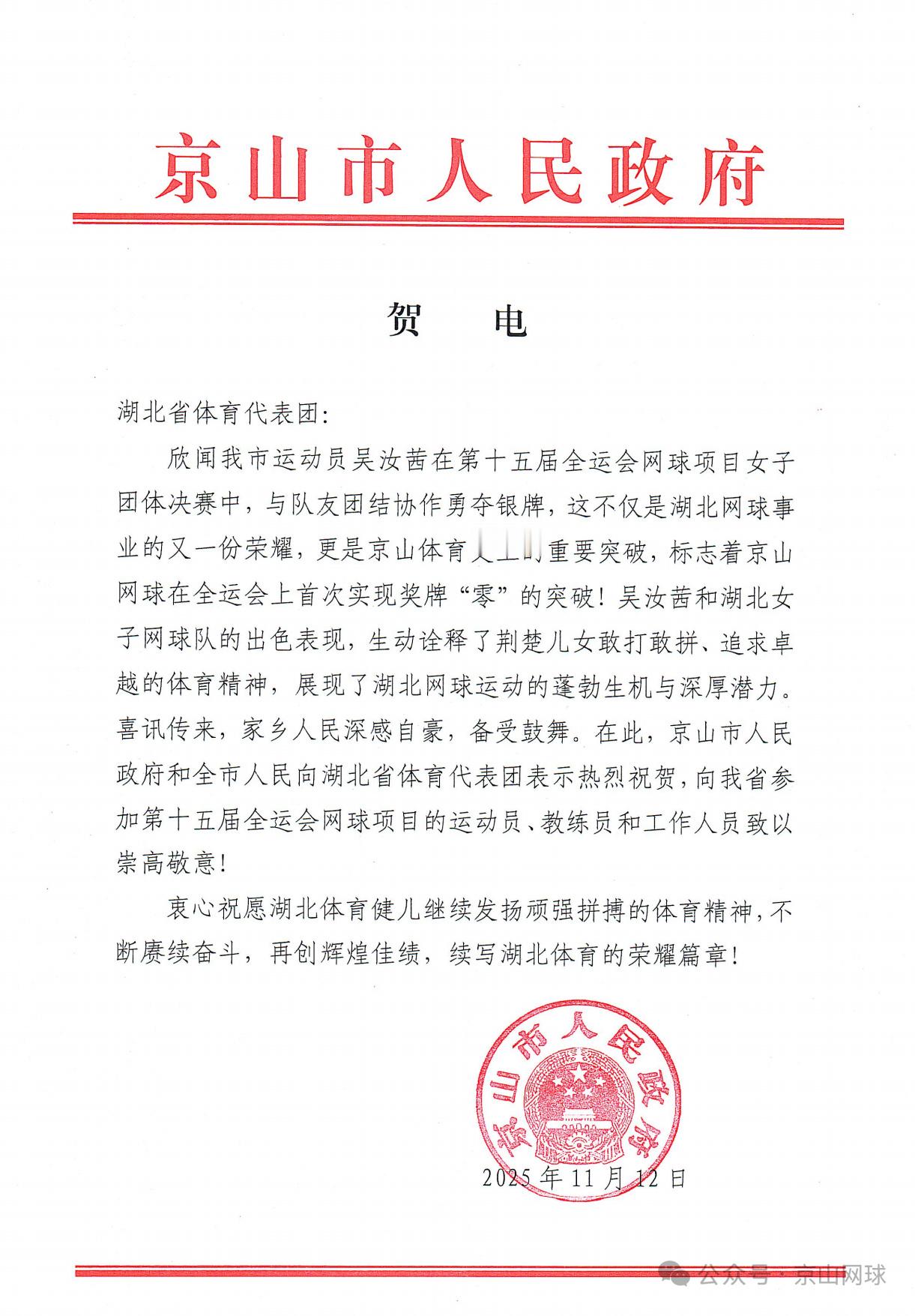 2025年11月12日,在中华人民共和国第十五届运动会上,京山小将吴汝茜所在的湖北青年组女子网球队团结拼搏、奋勇争先,最终夺得青年组女团亚军,取得京山网球历史性突破。