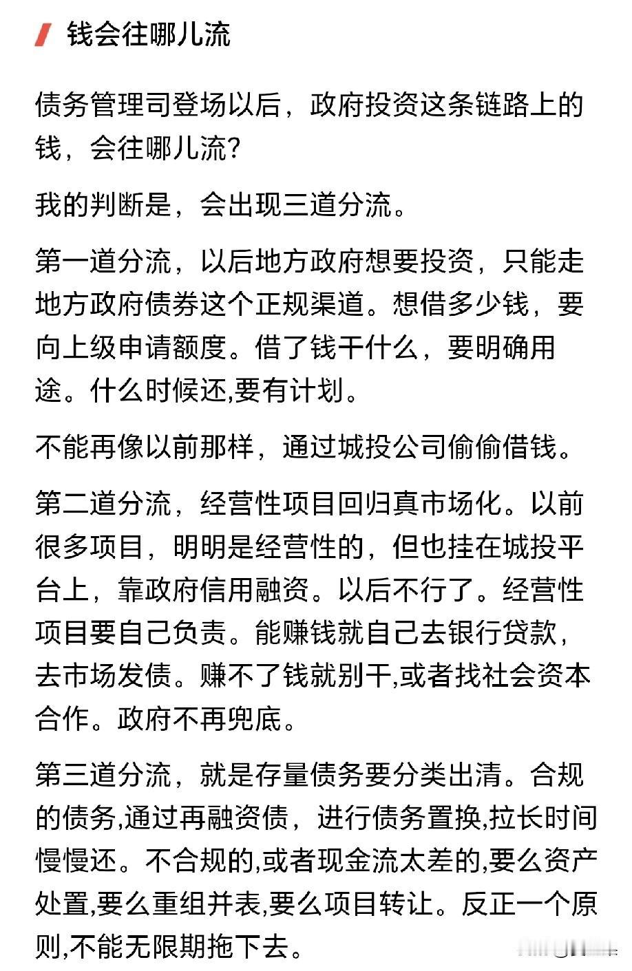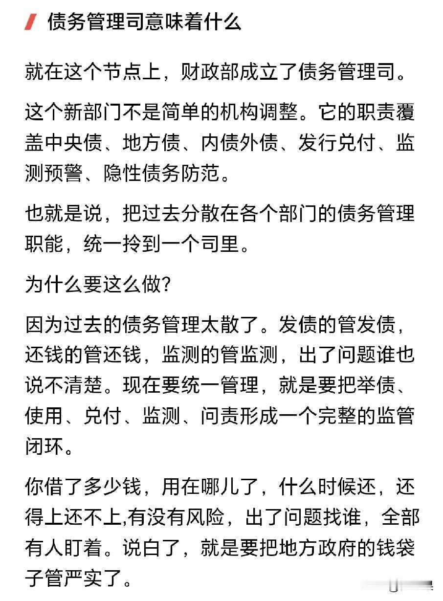 国家成立了债务管理司, 我还以为是国家出手,要来化解个人债务了。 其实不是, 是来管理地方城投债务的, 让地方投资更规范,更科学。 如果有人出手管管个人债务就好了, 有没有一种可能, 规定在某年至某年之间的个人债务全部取消, 我想那时候大家的幸福指数肯定蹭噌地往上涨吧。 现在有很多人因为个人债务问题处在崩溃的边缘。