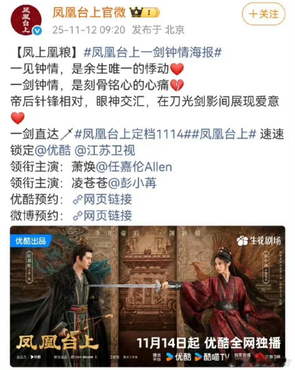 任嘉伦新剧《凤凰台上》又是上星又将于11月14日海外和中国台湾同步上线Netflix,烨华为了尾款也是努力了,钟姐得感谢国超啊