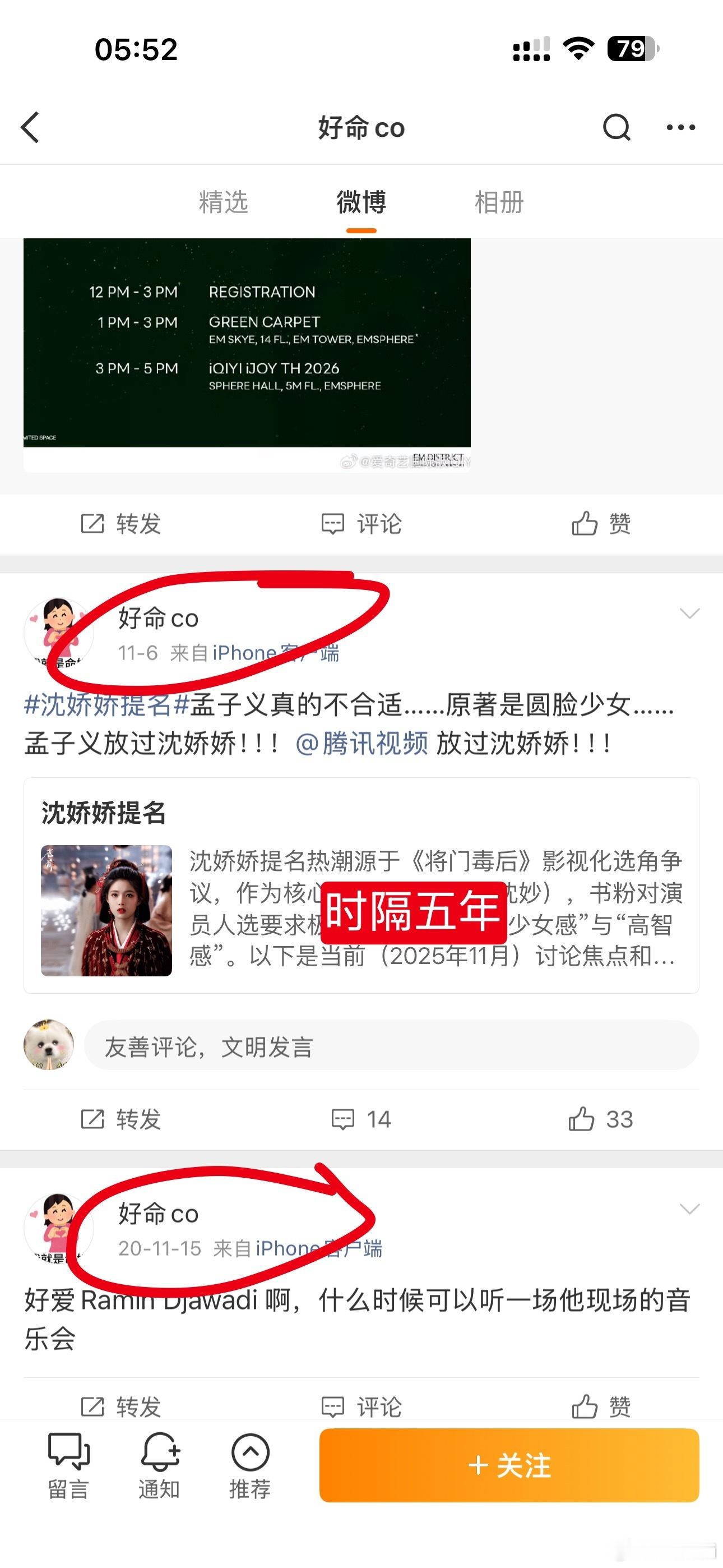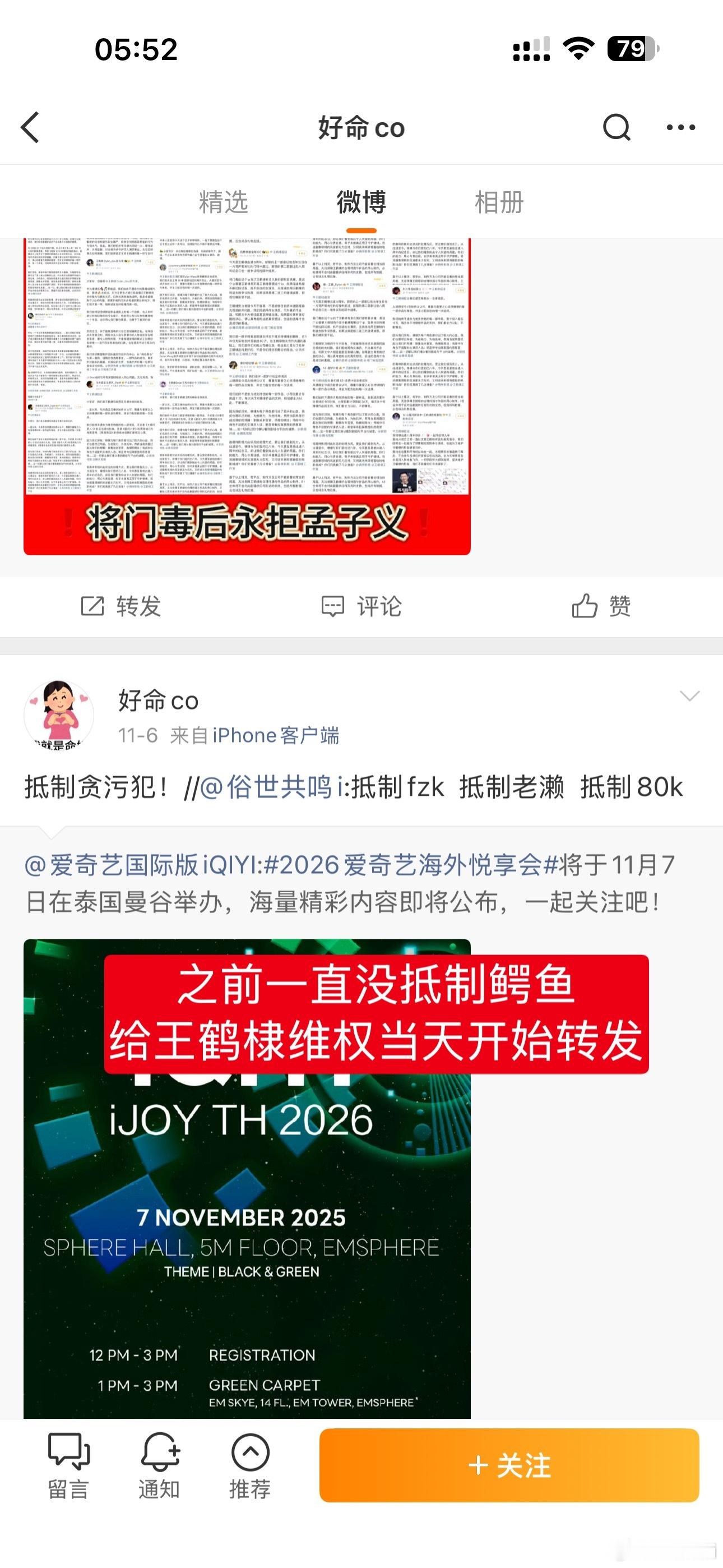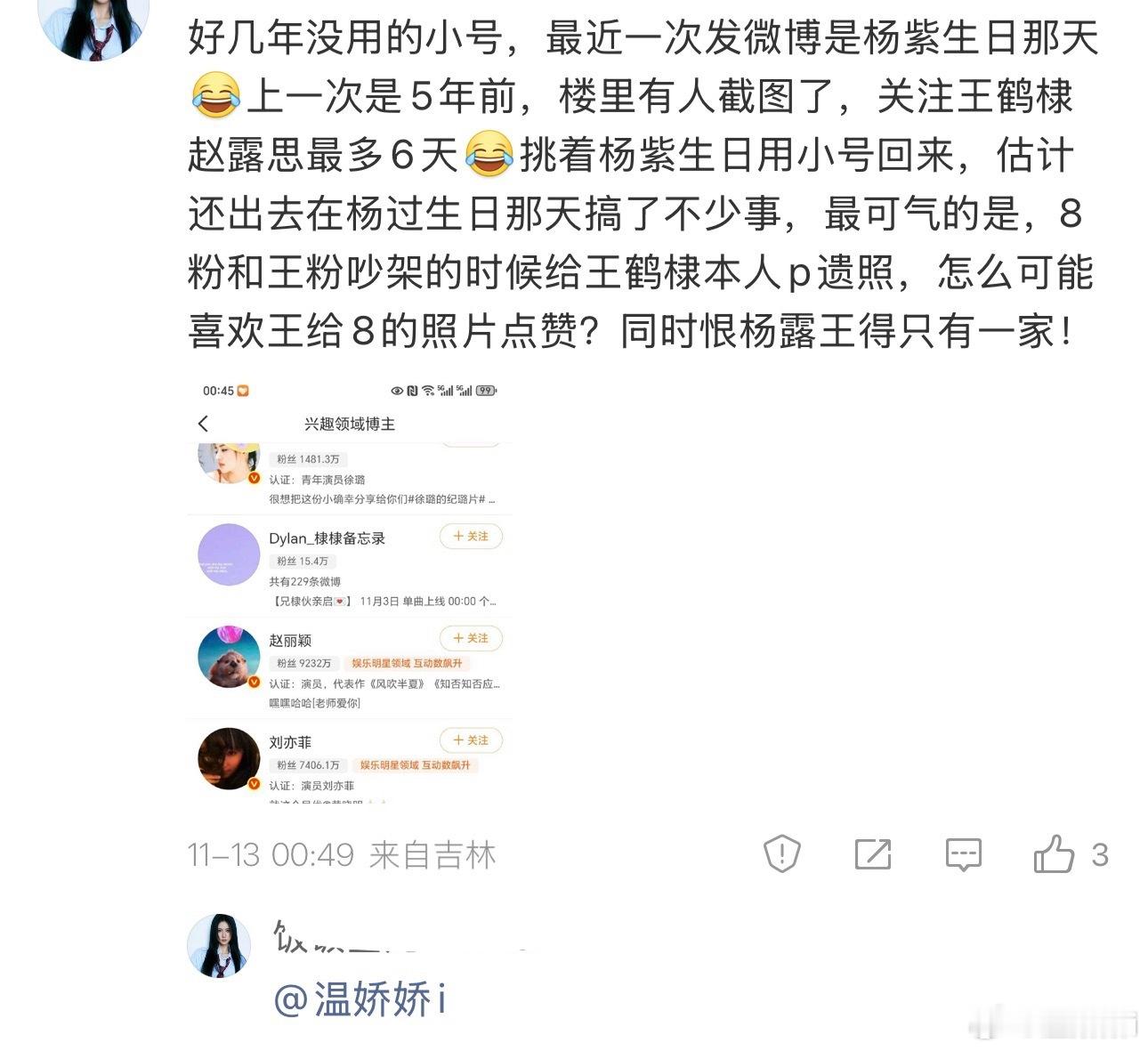 昨晚私信一直说我的那个人,我挂他的时候点赞图片里有热巴,被发现之后就把赞取消了,在王鹤棣家维权时出现的小号,当天还特意转发抵制鳄鱼,如果那么讨厌鳄鱼应该早早就发了。如果是专门维权的号应该专心致志做一件事,特别像在立人设,你们自行分辨哈我觉得这个人不对劲就是一般不会有粉丝因为我说一句人缘好就私信追着说我三观不正,在我多次说不想和他扯之后还一直发,感觉特别想激怒我。我之前就被某85花家在群里算计要这样子利用我,必须长个心眼,当然我只挂出剩下不关我的事,我也没有生气或者连带谁的意思。