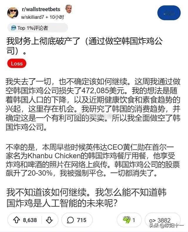 炸鸡概念股暴涨,有人因做空炸鸡股而一夜归零。 韩国股市也炒概念,因英伟达黄仁勋与三星李在镕一起吃了一顿炸鸡晚餐,导致韩国炸鸡概念股暴涨。 上周四晚上,黄仁勋与三星电子会长李在镕以及现代汽车执行会长郑义宣在一家当地餐馆小聚,喝啤酒、吃炸鸡。 虽然这家餐馆并未上市,但聚餐照片和视频在社交媒体上传播后,其竞争对手炸鸡概念股“Kyochon F&B”股价一度飙升20%。韩国家禽加工商Cherrybro股价也触及30%的涨停板,成交量是平均水平的约200倍。生产炸鸡机器人的科斯达克上市公司Neuromeka股价也显著上涨。 看起来,韩国股市在追逐热点概念,爆炒投机方面一点都不亚于我大A,类似事件还曾发生于2025年8月,因特朗普称赞韩国总统所用钢笔,文具商MonAmi股价大涨。 最好笑的是,一名美国投资者因做空韩国炸鸡股,在本次暴涨中损失47万美元,最终被强制平仓。而其做空逻辑是韩国人口下降、素食趋势将会导致韩国炸鸡销量一路下滑,事实上也确实如此。但仅仅因为黄仁勋的一顿炸鸡聚餐被彻底颠覆,短短一夜之间损失殆尽,何其无辜。