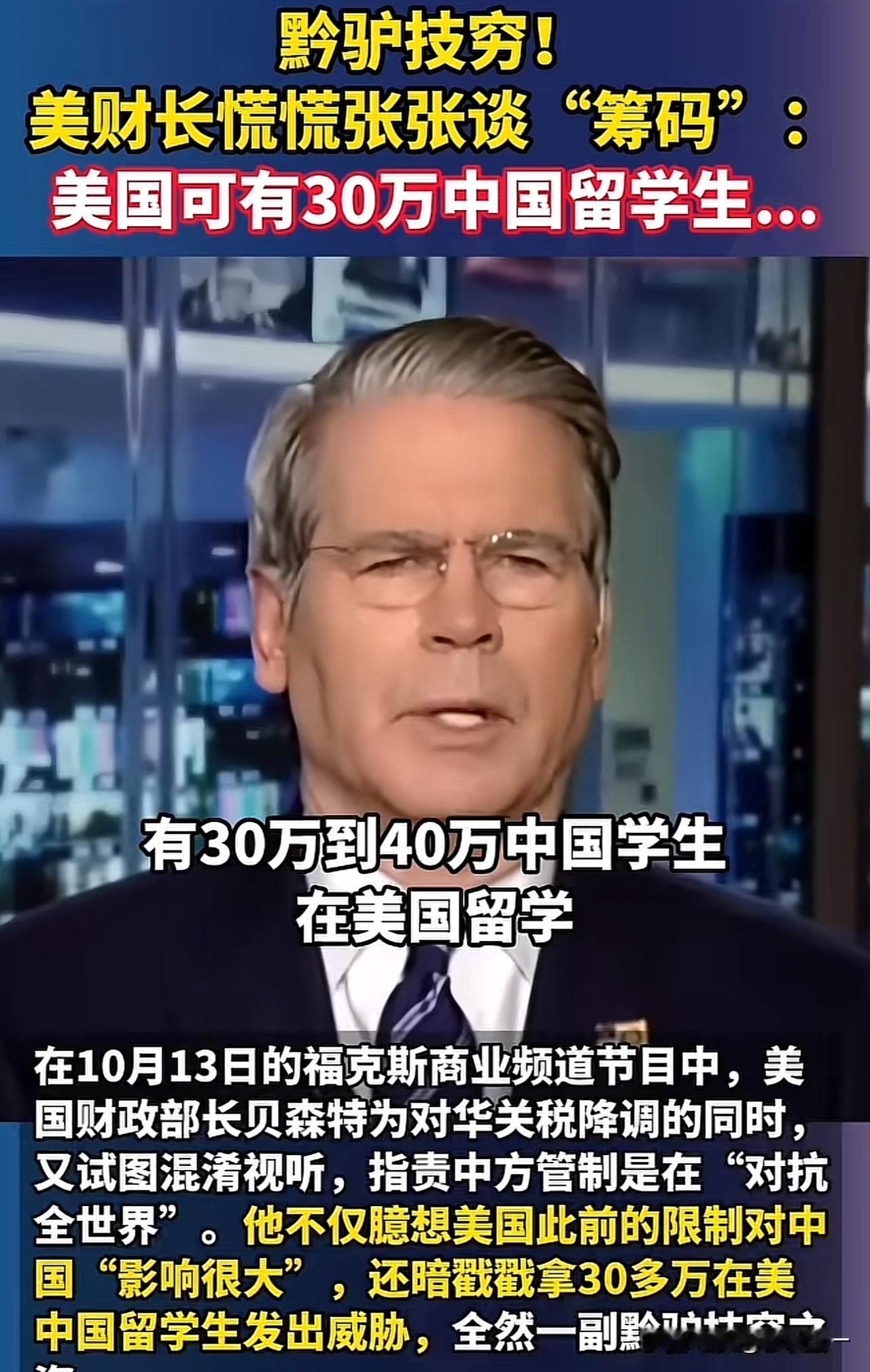 美国人确实有些黔驴技穷了,先是凭空造出一张“关税牌” 然后全世界到处炸,搞得全球一片鸡飞狗跳。 然后碰到一个带头反击的,立马变成怨妇,从总统开始领头抱怨,喋喋不休的说人家伤害了他。 这不,美国财长贝森特又开始抱怨了。 周三发布会上,他公开指责中国贸易谈判代表在谈判中“缺乏尊重”、态度强硬,称其“未经邀请抵美”并抛出“若港口费通过,中国将制造全球混乱”的威胁。 贝森特活脱脱是“恶人先告状,反咬一口”,明明是自己先挑衅,美国人似乎已经不习惯有人会反击了,结果被人呼了一巴掌,懵了,狗急跳墙的到处宣扬别人霸凌自己。 更可笑的是前两天贝森特还用几十万中国留学生来威胁,可见真是黔驴技穷了。 而我们则是稳坐钓鱼台,根本不和你打嘴炮,现在的媒体传播已经不是十年前的,单方面听你的洗脑,现在社交媒体传播真相的速度惊人,已经没人吃特朗普那一套胡言乱语了。
