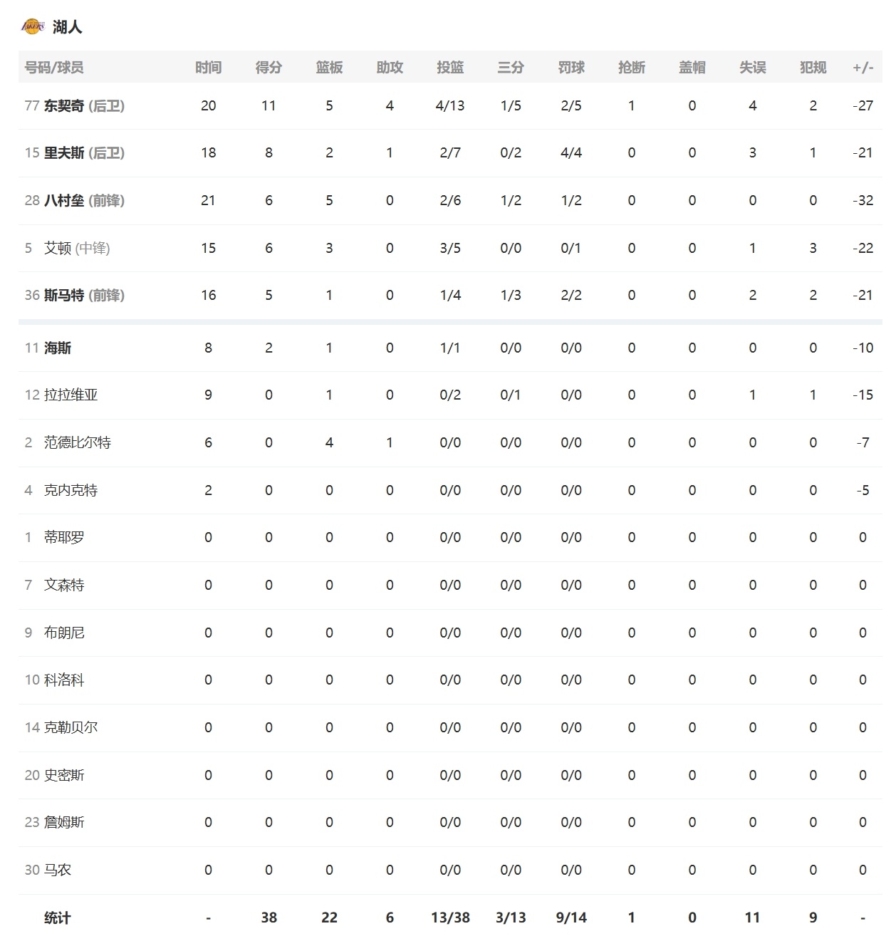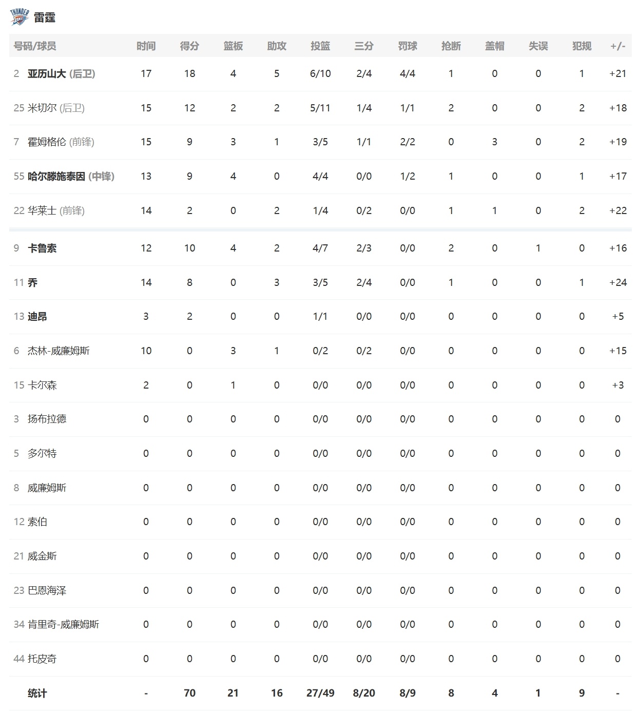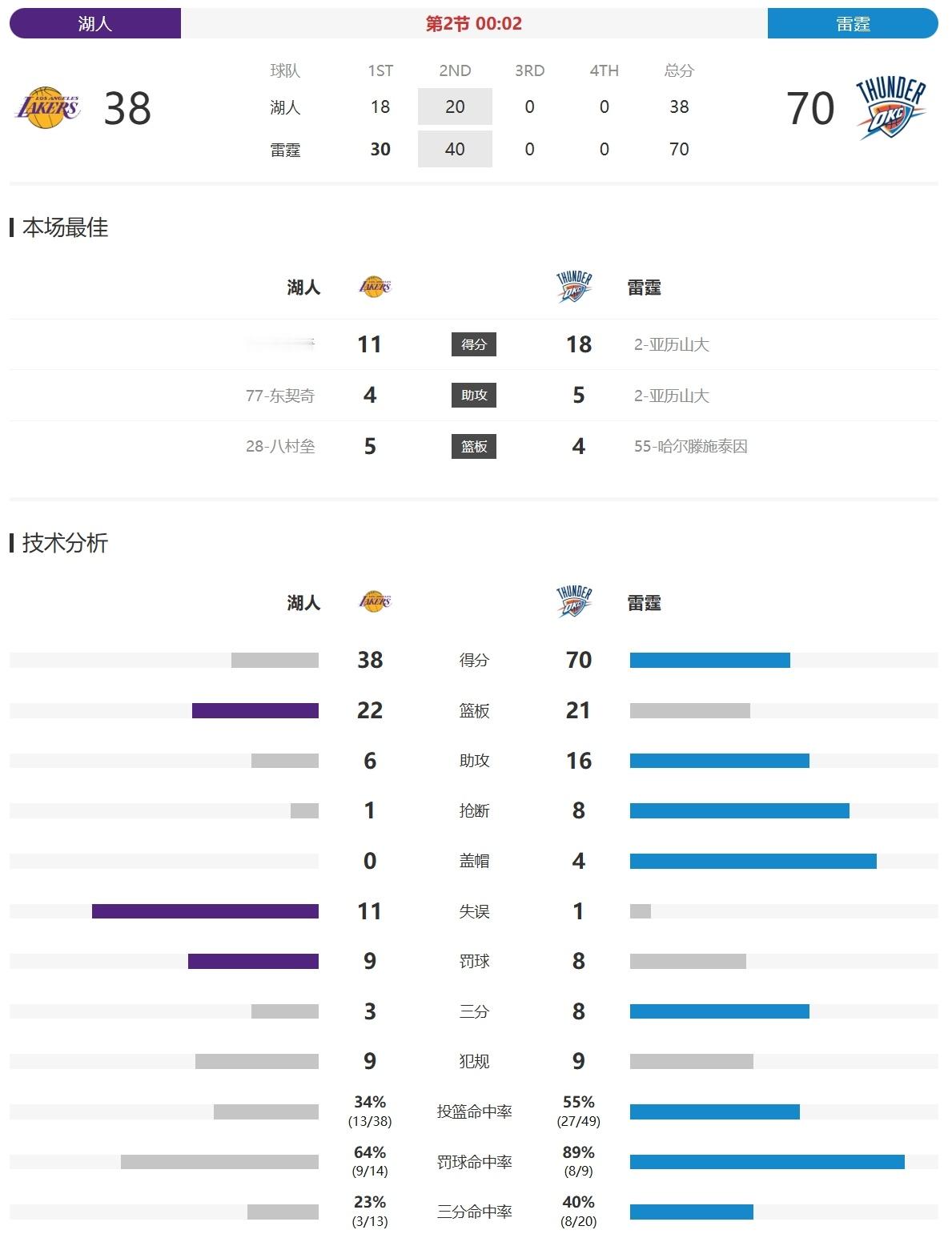 半场结束,雷霆70-38领先湖人进入第三节!亚历山大10中6砍下18分4篮板5助攻1抢断,米切尔11中5拿到12分2助攻2抢断,切特得到9分3篮板3盖帽,哈腾9+4,卡鲁索7中4拿到10分4篮板2助攻2抢断,意思啊亚桥8分3助攻!