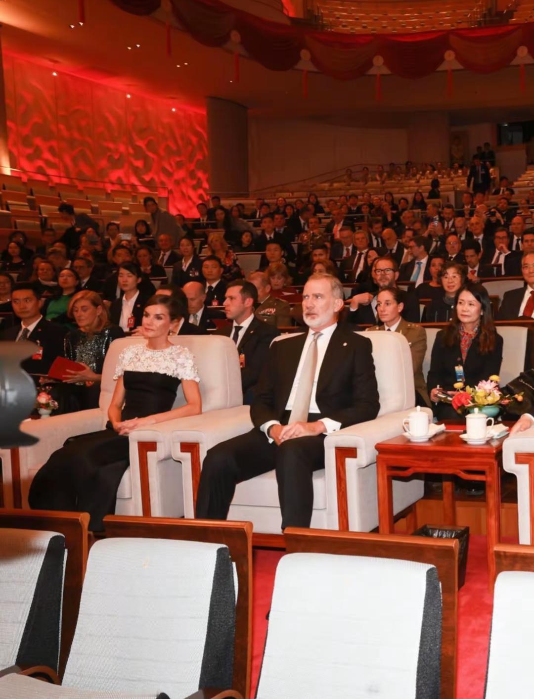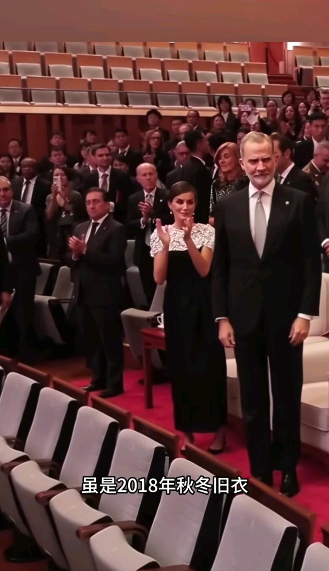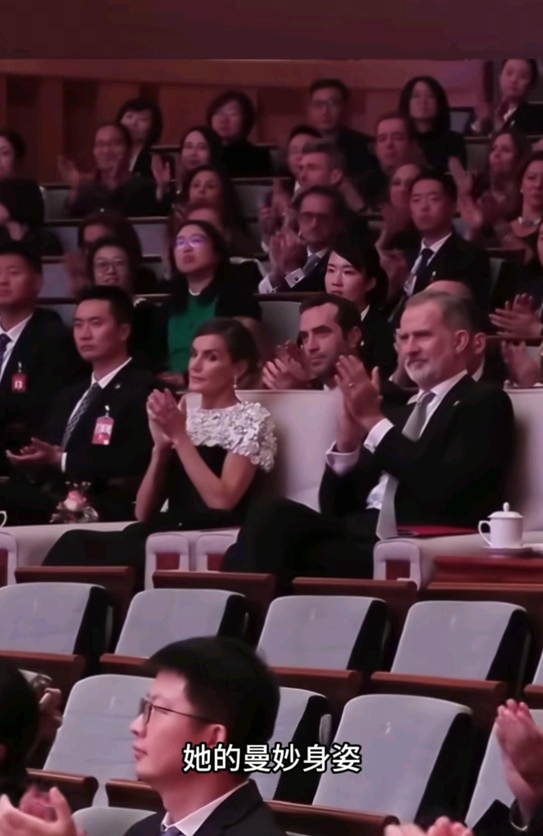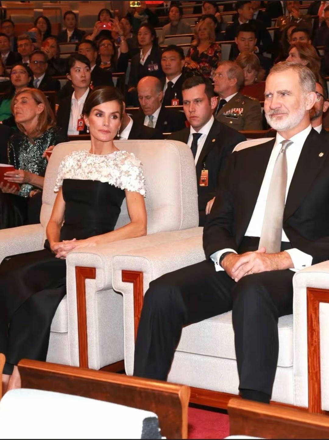 11月12日晚上,莱蒂奇亚王后在北京国家大剧院欣赏马德里皇家剧院管弦乐团在中国的首场演唱会。 莱蒂奇亚王后坐在大剧院的最佳观看位置端正的坐着与国王一同观看,国王穿着西装和白色衬衫,莱蒂奇亚穿着黑白连衣裙晚礼服,争显高贵气质。 莱蒂奇亚王后这次来华,陪访团就有马德里皇家剧院,在异国他乡欣赏本国的音乐,是一场不一样的体验。在观看过程中,莱蒂奇亚鼓掌,演出结束后,莱蒂奇亚起身为精彩演出鼓掌。