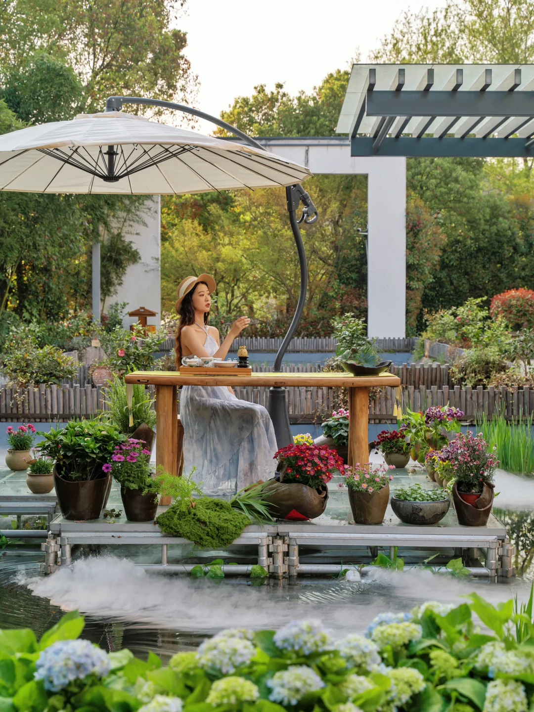坐在花丛中品茶看花,好是惬意舒服!