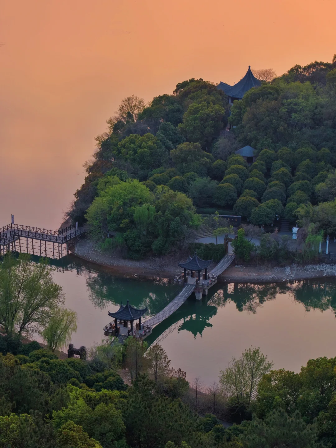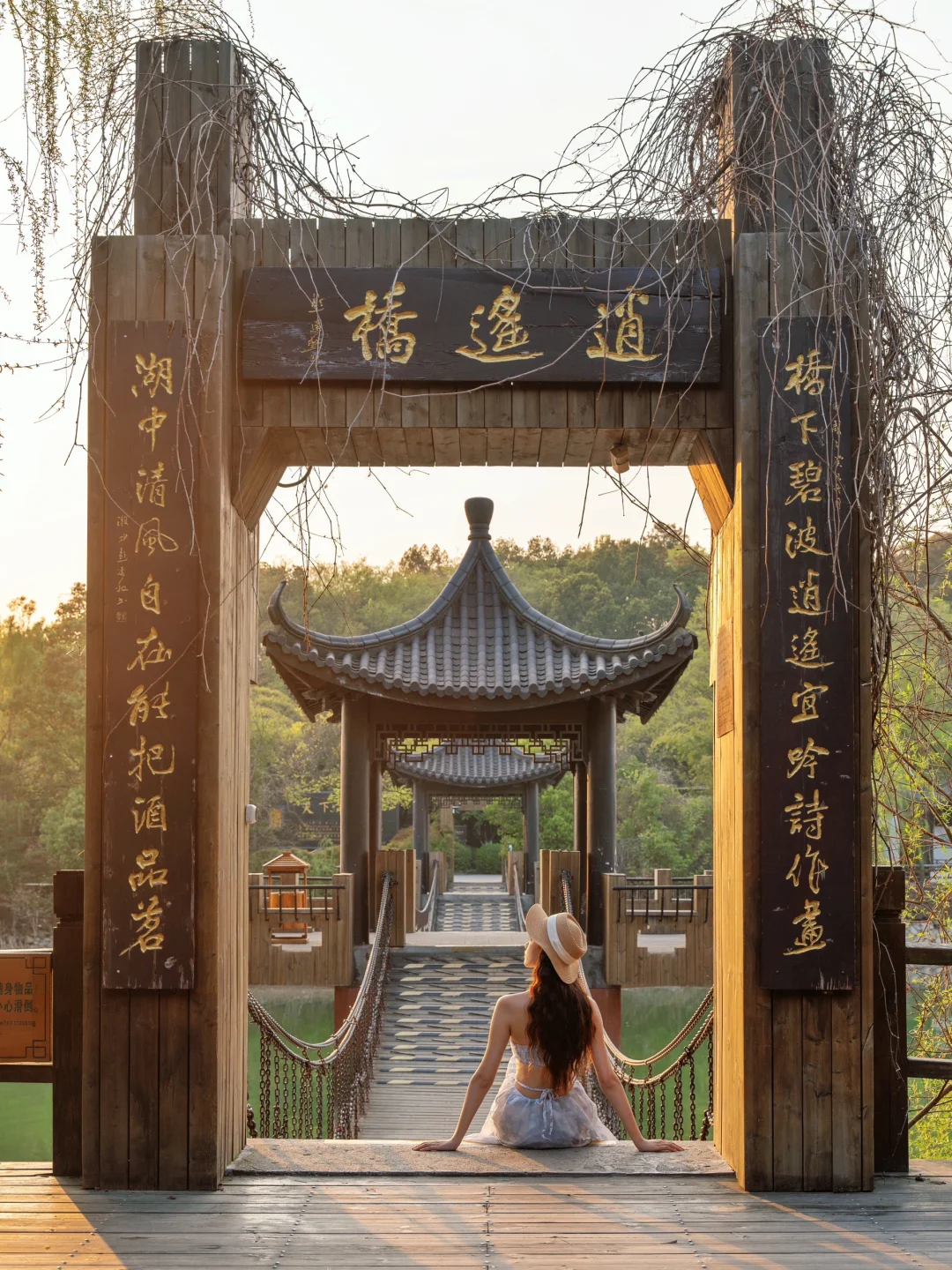 坐在逍遥阁的索桥上,夕阳洒下来好美!