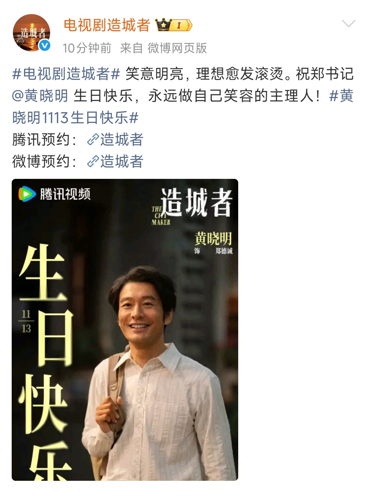 《造城者》为黄晓明庆生,晓明哥生日快乐啊🎂,期待早日见到郑书记!