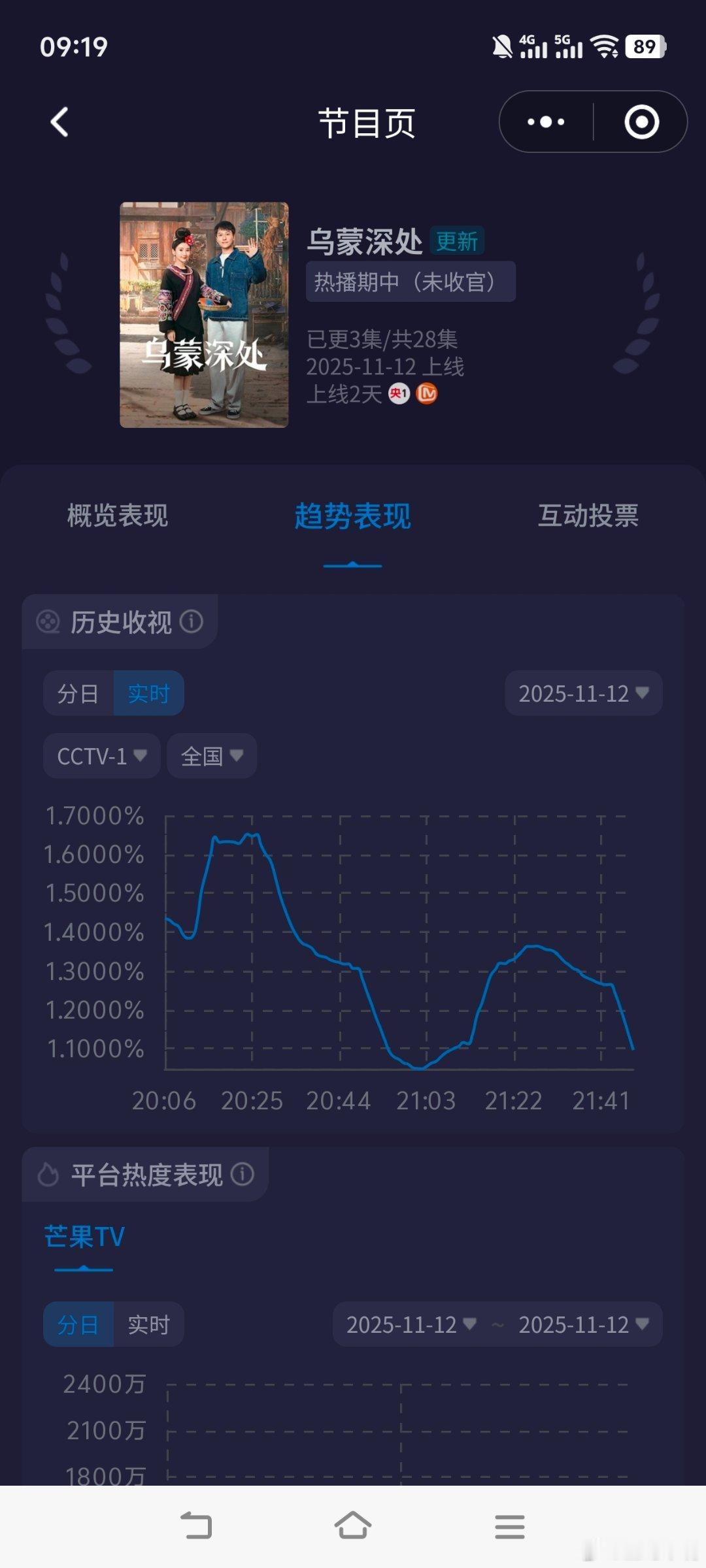 《乌蒙深处》首播收视快报:酷云峰值1.6518,平均1.3200,cvb估值1.3200×2.10=2.772