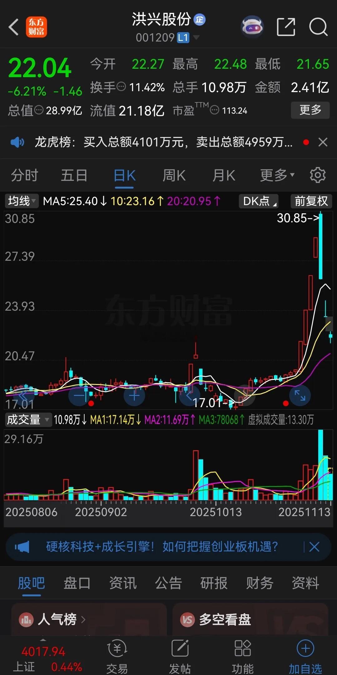 这走势堪比杀猪盘!四个涨停后,股价崩盘式下跌,上演“A”字杀,从30.85元跌到了21.65元,三个交易日股价跌去30%,股价已经跌到第一个涨停的位置,这几天抄底的股民几乎全被套。这种股票基本上都是游资和量化所为,一般流通市值比较小,主力通过首板快速拉涨停,二三四板加速,吸引投资者,待散户大量进场,直接放量出货,典型的“三板组”股票,今年这种走势很流行,专治喜欢打板追涨的散户。