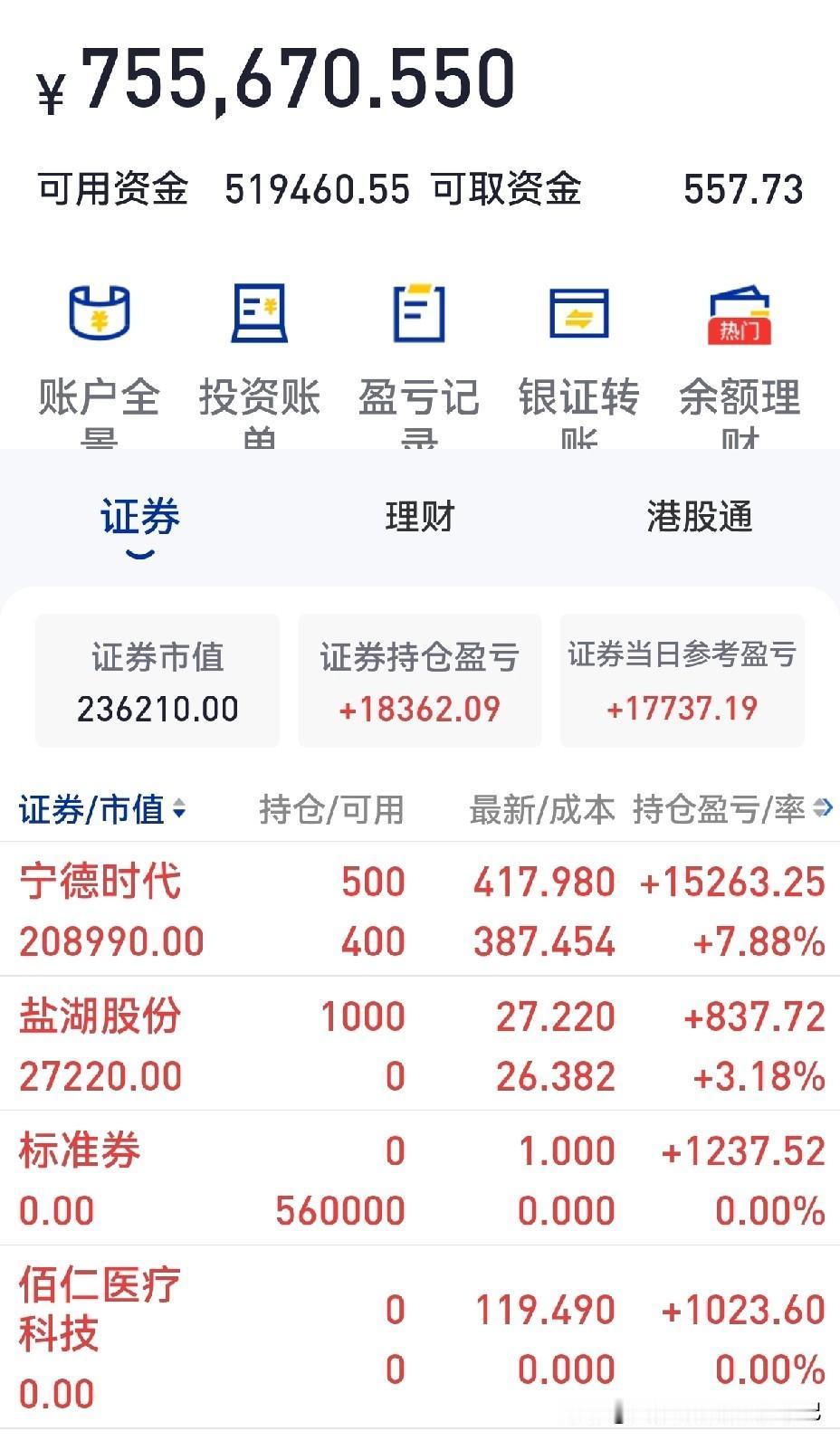 今天的走势证明我昨天蒙对了,我昨天认为A股会止跌上涨,宁王会大涨,今天都实现了,截止午盘收盘我账户浮盈17700元。 从目前的走势看,下午上证很有可能突破4025点,宁王也有望突破425元。 有谁抄我的作业吗?这个月抄我作业的人有可能比我赚的都多。