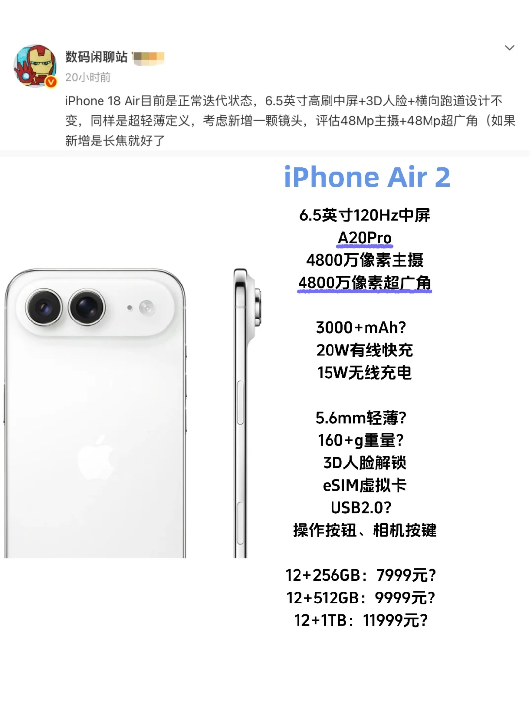 网传iPhone18Air会继续迭代,也就是iPhoneAir2,整体产品定义不变,依旧主打超轻薄,可能会新加一个摄像头,可能是4800万像素超广角,不知道还是长焦,如果还是卖8000多块,你们会考虑吗?