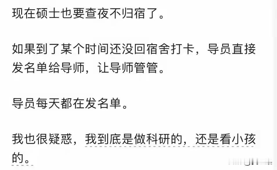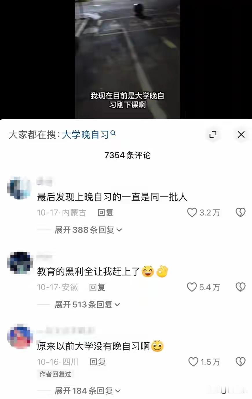 大学高中化,真让人吃惊。 一位同事的孩子,在大学里还要上早操,上晚自习点到,每天课排得满满的, 还有家长群,同事就在里边,经常收到信息。 这难道不是高中生活吗? 记得自己上大学的时候,谁上过早操啊,都是自由, 想跑操的早起去跑,不想跑操的如果头两节没课,能睡到九点多。 晚上谁管你上自习? 当然很多自觉的还是去教室写作业。 周六日舍友有的找老乡去了,有的谈恋爱去了,有的不知道上哪玩去了,没人查。 每天晚上只要10点前回寝室就行, 记得有回来得晚的,在宿舍楼下叫唤,央求宿管阿姨开门, 然后是宿管阿姨骂骂咧咧地出来,一边开门一边强调纪律,学生都是有的说好话,有的迅速飞奔上楼回宿舍。 那时候辅导员真轻松,上一个学期都不一定见到, 现在呢,天天看着学生,生怕学生有个风吹草动。 要说严格管理也是好事, 对学生对老师对学校都好, 家长放心老师放心学校放心。 就是怎么觉得好不容易上了大学,没有大学味儿了呢?