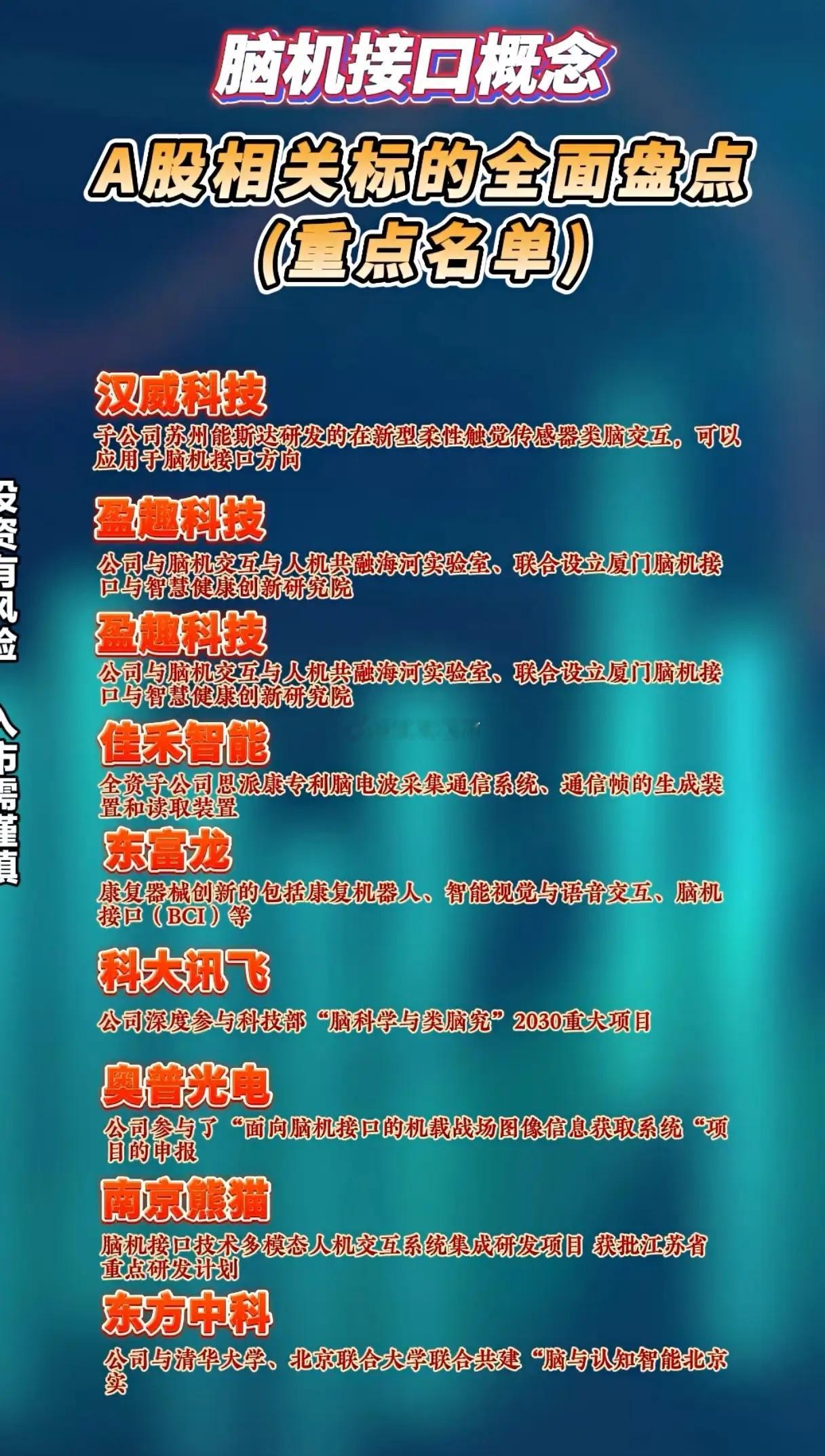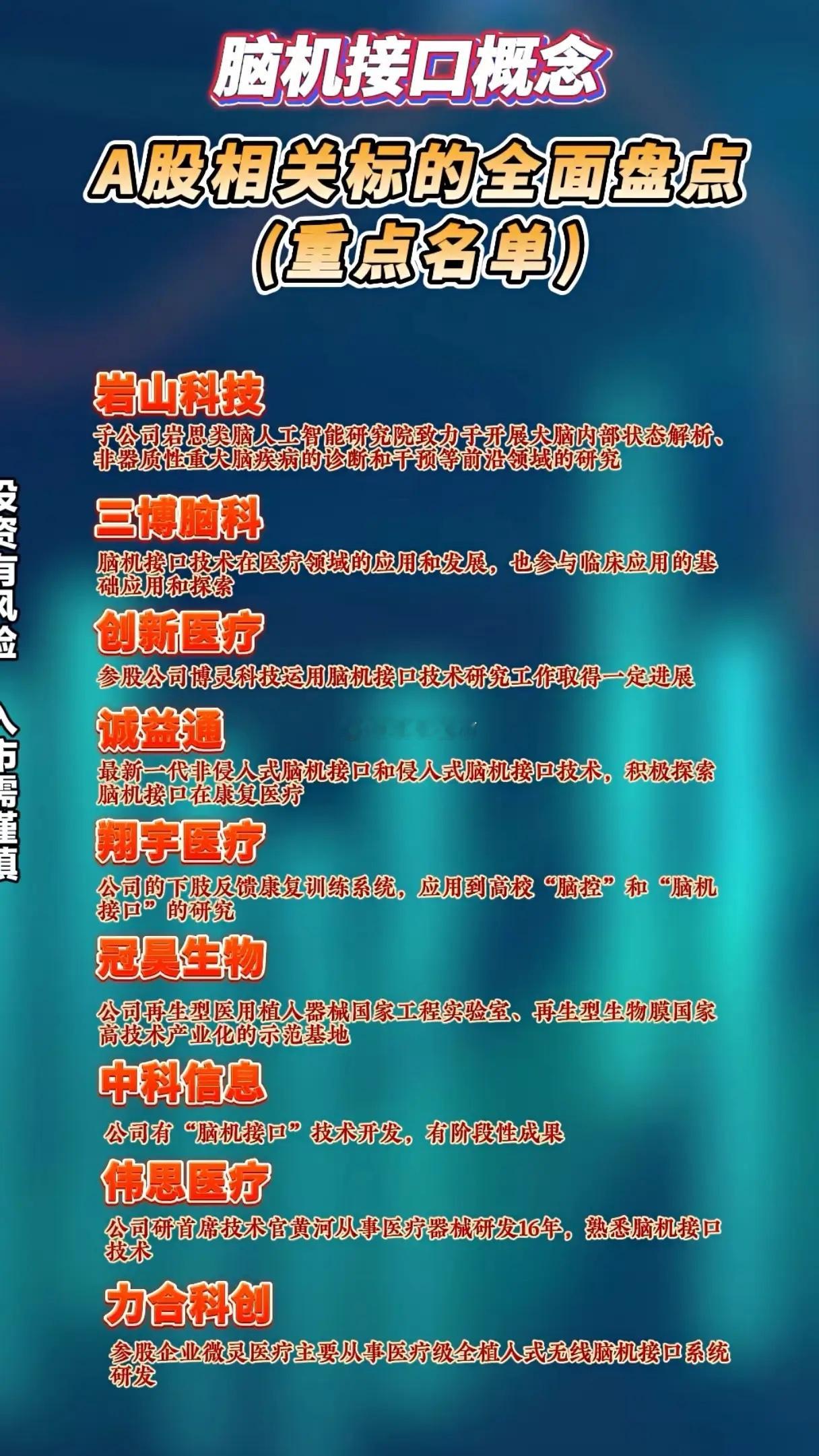 脑机接口(BCI)是通过技术手段建立大脑与外部设备的直接信息交互通道,核心是实现脑电信号的采集、解析与指令输出,当前已在医疗康复、类脑智能等领域形成落地探索。从技术进展看,国际层面,Neuralink等企业的侵入式脑机接口已实现动物实验向人体临床的突破,可辅助渐冻症患者完成简单指令;非侵入式领域则在脑电信号精度与场景适配性上持续升级。A股相关标的已围绕脑机接口产业链布局:医疗端,三博脑科、创新医疗等聚焦临床应用探索,诚益通覆盖侵入/非侵入式技术并拓展康复场景,力合科创参股企业研发医疗级全植入式系统;技术研发端,岩山科技通过子公司布局大脑状态解析等前沿研究,中科信息、南京熊猫等依托科研项目推进技术落地;硬件配套方面,佳禾智能布局脑电波采集设备,汉威科技的柔性触觉传感器可支撑类脑交互。此外,科大讯飞、盈趣科技等通过参与国家级项目、共建研究院,推动脑机接口与智慧健康等场景的融合。当前脑机接口仍处于技术验证向商业化初期过渡阶段,A股企业多以细分环节参与,核心突破点集中在医疗场景的临床适配与信号解析技术的精度提升。