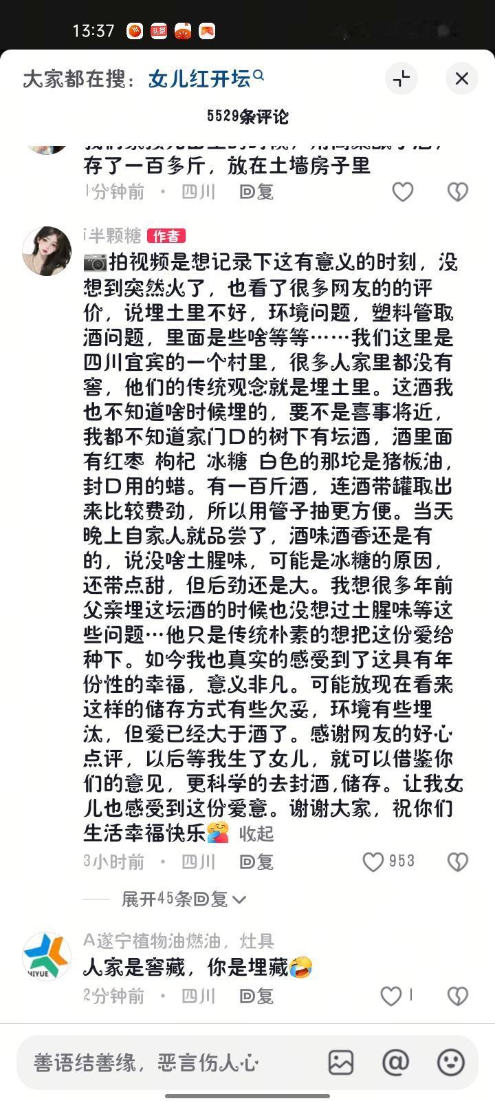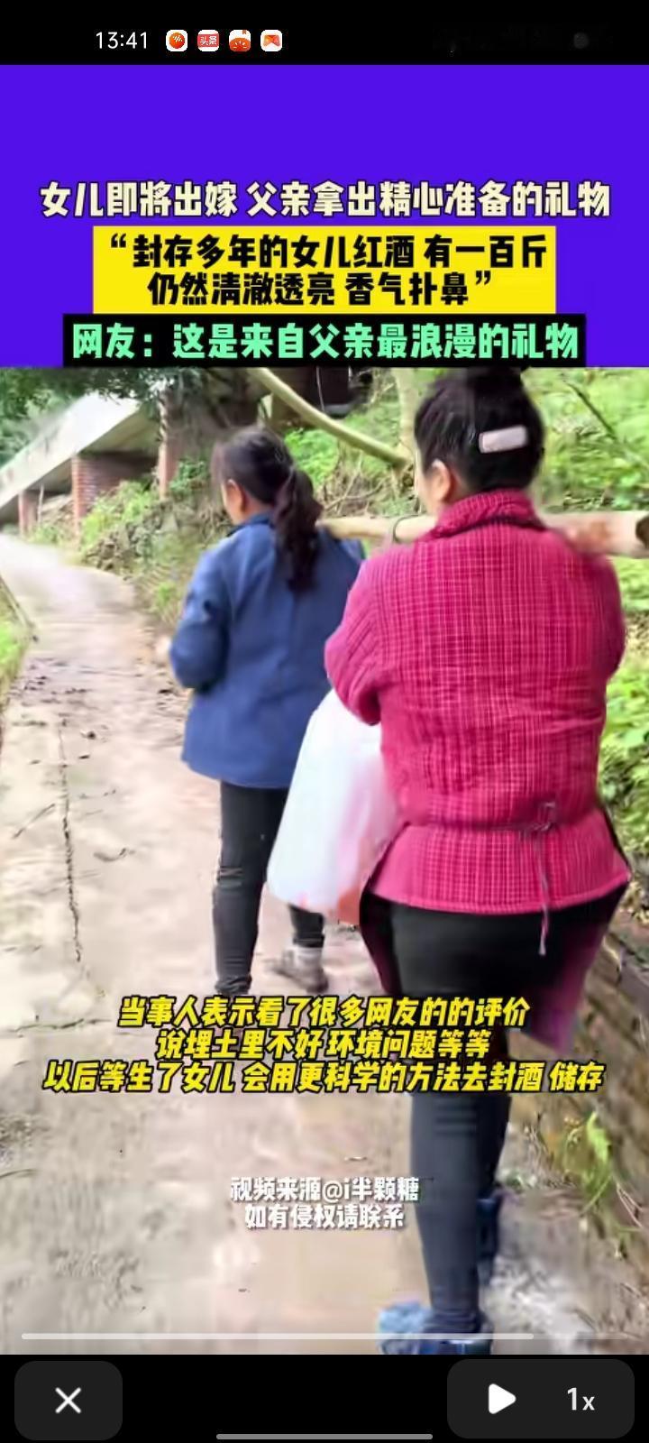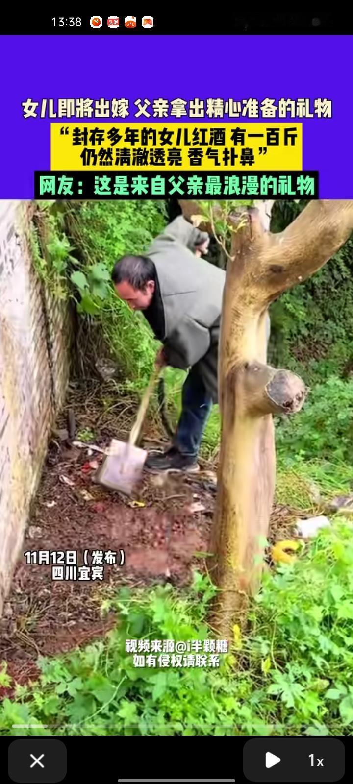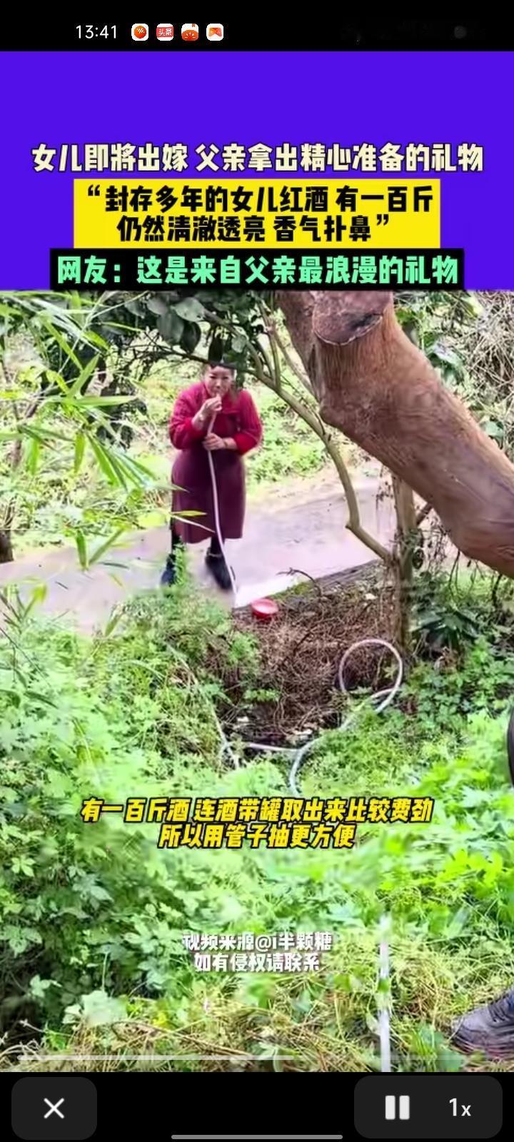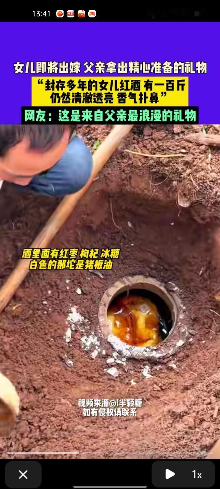 11月12日,四川宜宾。女儿即将出嫁,父亲掏拿出精心准备的礼物—女儿红,封存多年依旧清澈透亮,香气扑鼻。这罐酒有100斤,连酒带罐取出来很费劲,用管子抽比较方便 当事女生称,看了很多网友的评价,说埋土里不好、环境问题等,以后等生了女儿,会用更科学的方法去封酒储存。