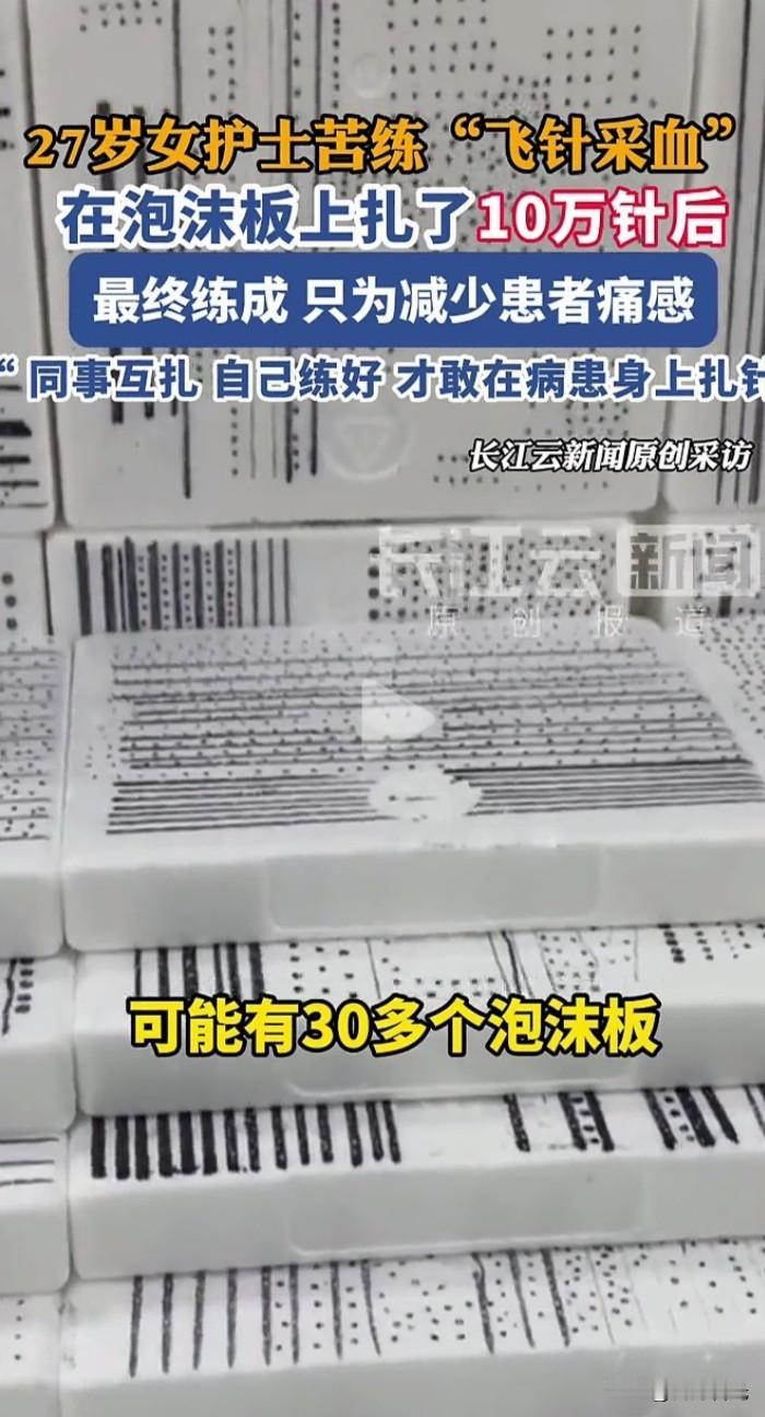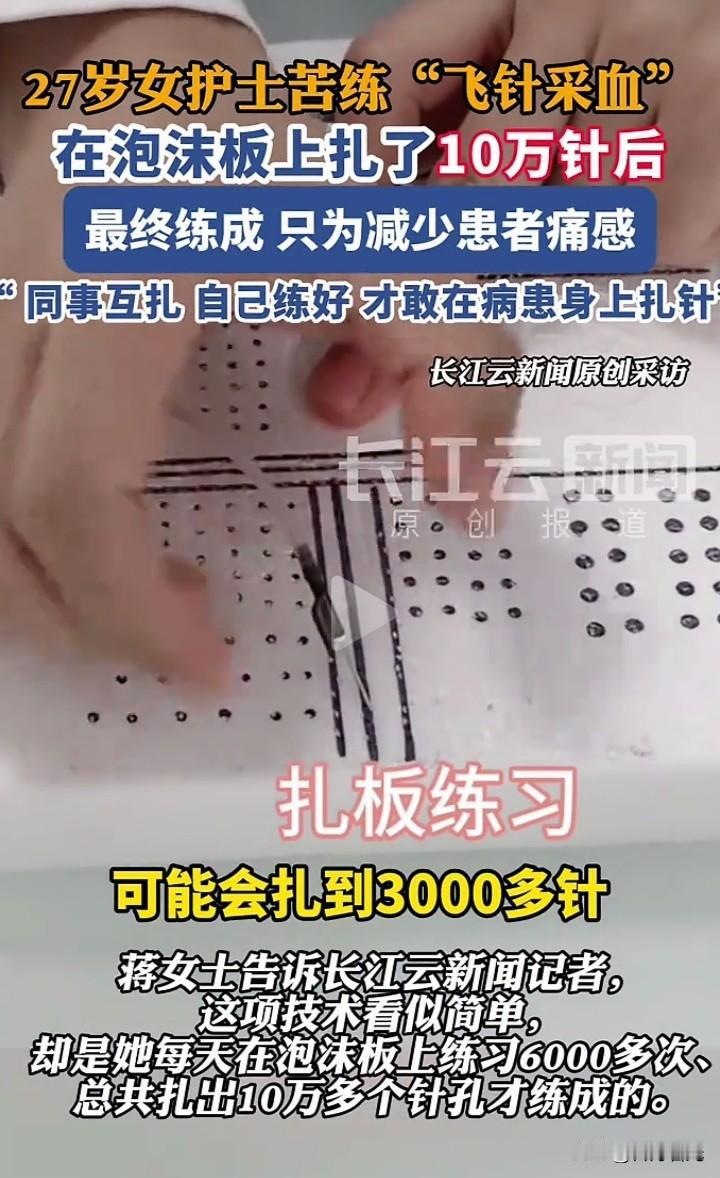 飞针10万,医者仁心。27岁的女护士为了练习扎针采血,每天在泡沫板上练习飞针6000余次,总共扎了有10万多针,还要有和同事不停互扎练习实践,最后才能在患者身上扎针采血。年轻女护士的精神感染了我,赠一首诗,赞扬医护人员大美精神。 赞白衣使者 泡沫为砧针作锋,朝朝暮暮练精功。 六千次起落凝巧,十万回穿刺见诚。 互扎肩头知痛暖,轻拈指下辨深浓。 终成妙手施仁术,不负殷殷患者容。 (图片来自网络侵删)
