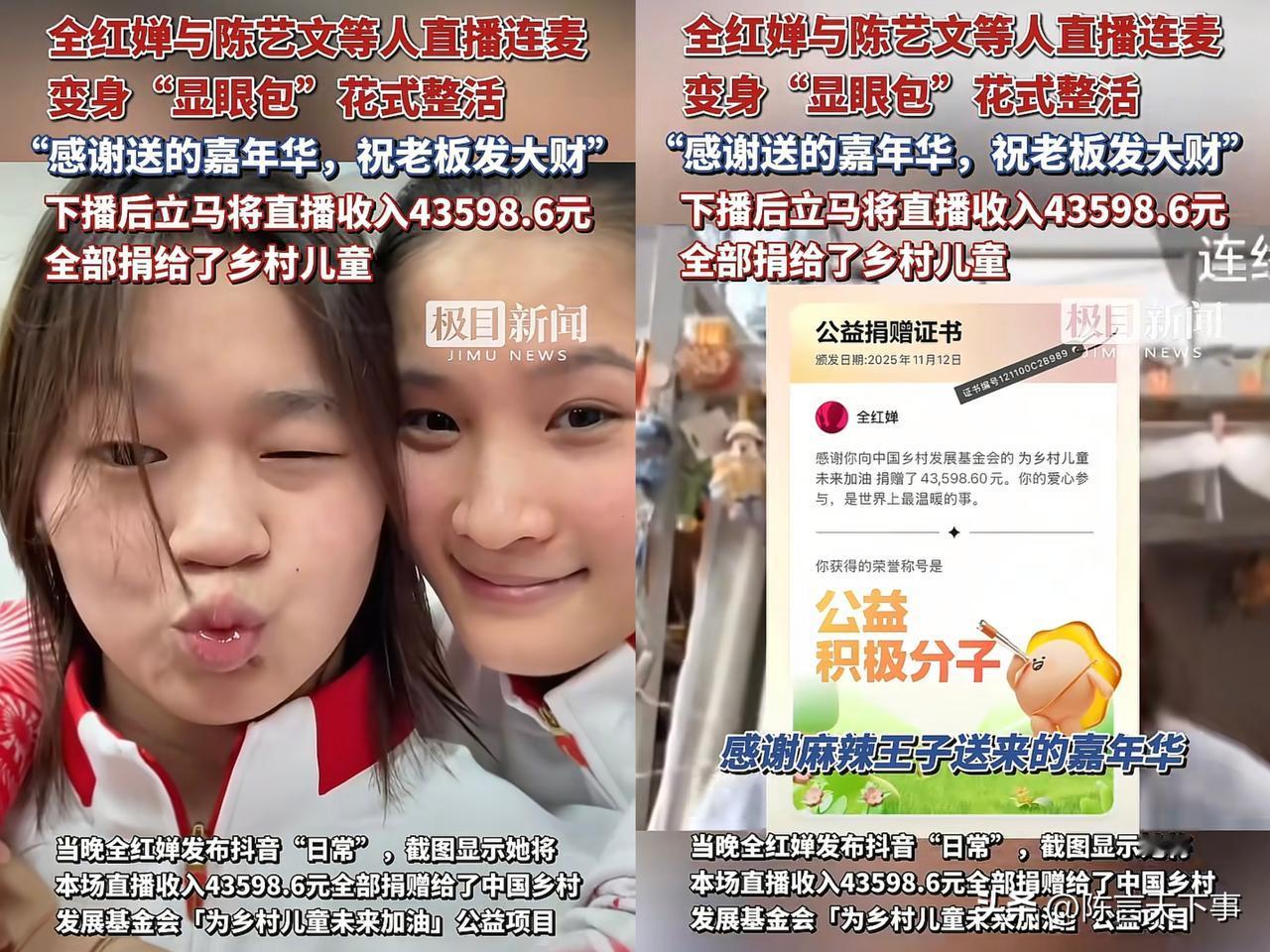 你就说她这样做对不对,值不值得表扬! 比赛都结束了,她和队友连麦聊聊天,这个行为很正常,大哥们是出于对婵宝的喜欢,所以给她打赏,合理合规。 而婵宝的表现更值得表扬了,她直播一个小时一共收到43598.6元,下播后马上就把这笔收入捐给乡村儿童了。 她也是农村出身的,知道村里的孩子需要怎样的帮助,她也是能帮一点是一点。
