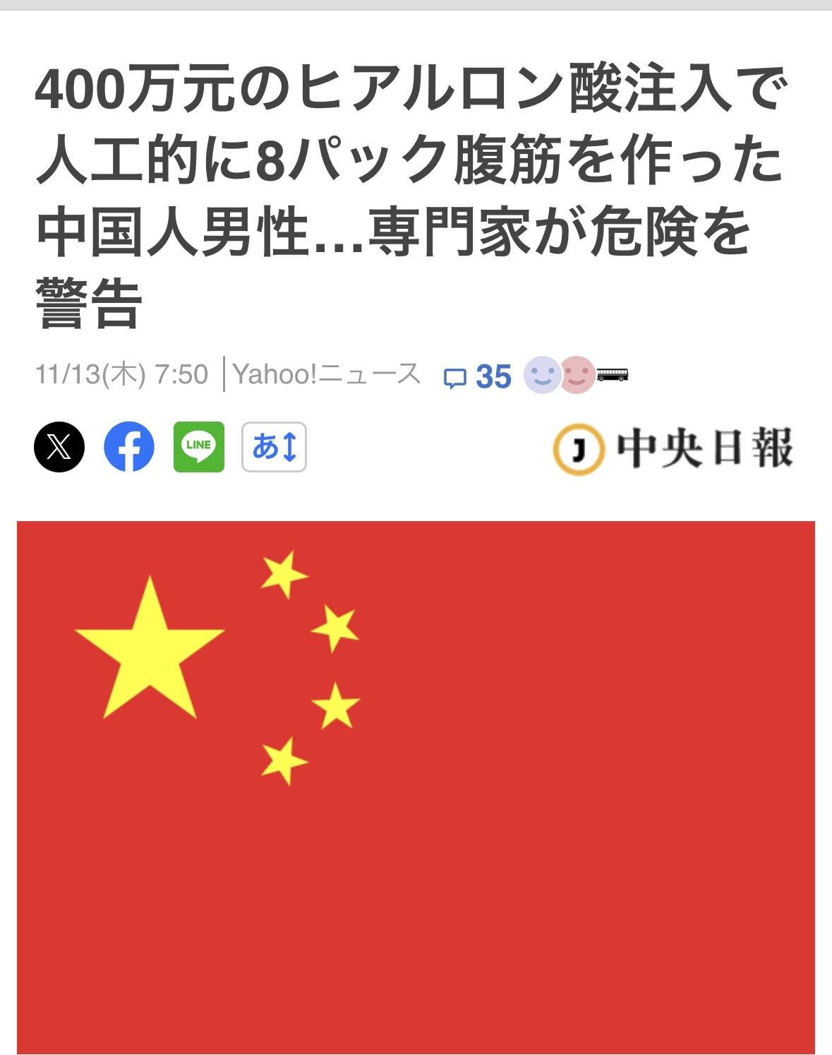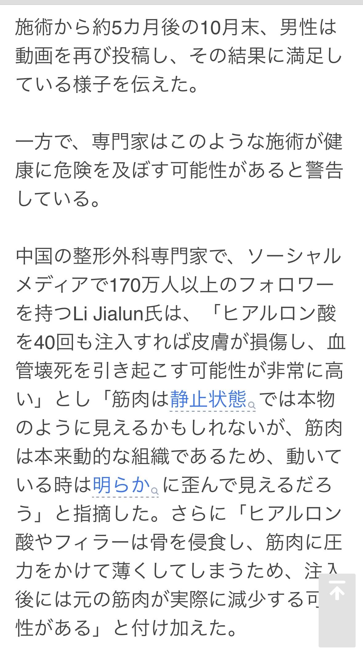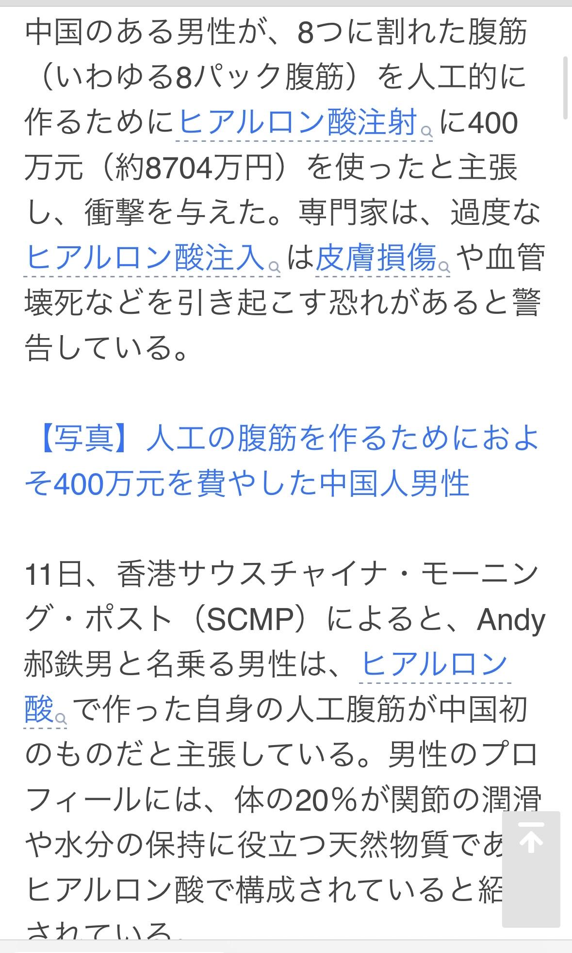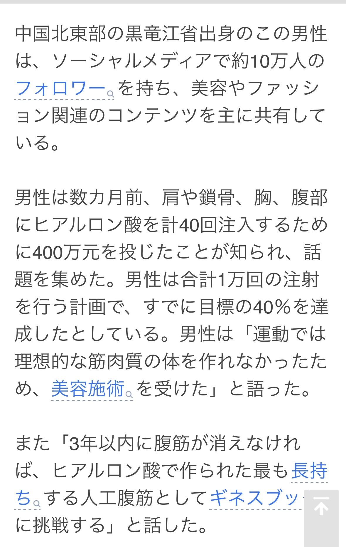 黒龙江男子花费400万元人民币注射玻尿酸,打造人工八块腹肌。 男子声称,他用玻尿酸打造的人工腹肌是中国首例,男子身体成分的20%是玻尿酸。肩部、锁骨、胸部和腹部注射了40针玻尿酸,计划注射1万针,并声称已经完成了40%的目标。 男子表示:如果腹肌在三年内没有消失,将尝试打破吉尼斯世界纪录,成为玻尿酸人工腹肌保持时间最长的人。 整形外科医李嘉伦表示:注射40次玻尿酸极有可能损伤皮肤并导致血管坏死。肌肉静止时看起来可能很逼真,但由于肌肉本身是动态组织,运动时会显得明显变形。玻尿酸和填充物会侵蚀骨骼并压迫肌肉,导致肌肉萎缩,因此注射后原有肌肉质量可能会减少。