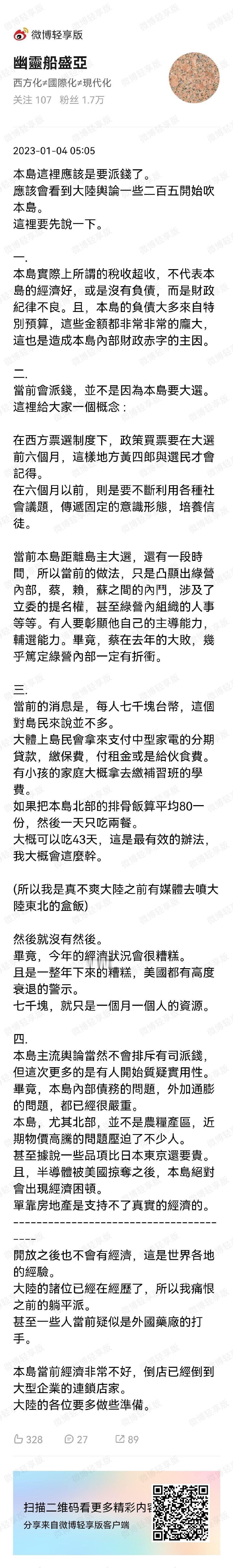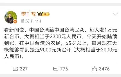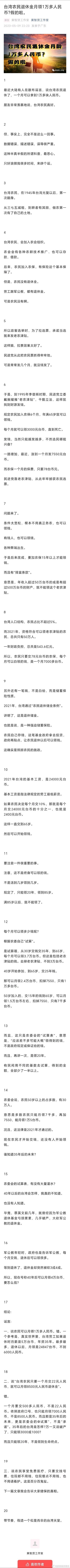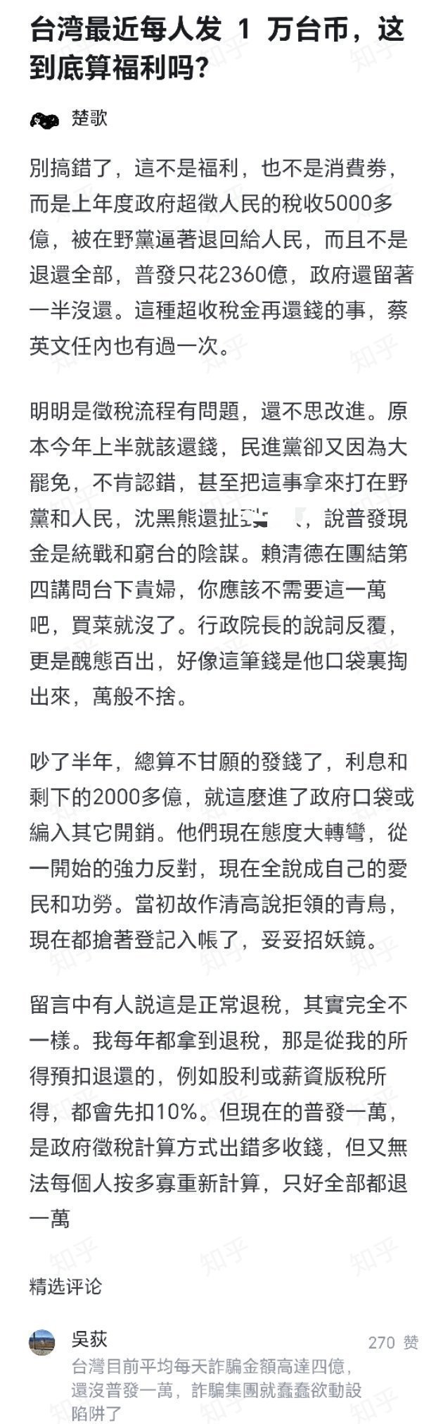 为什么不说全呢。台湾网友早说了,2023年台湾被曝光税收超征4500亿,被一直隐瞒,后来曝光,曝光的时候已经被民进党当局花了3000亿,这剩下的1500亿,民进党又扣了400亿左右“以备不时之需”,最后选择普发现金,而不是退税,因为退税的话账算不清。这是2023年的,2025又一次。和上次一样。其实看一下新闻也知道。很多台湾交税的是不满意的。