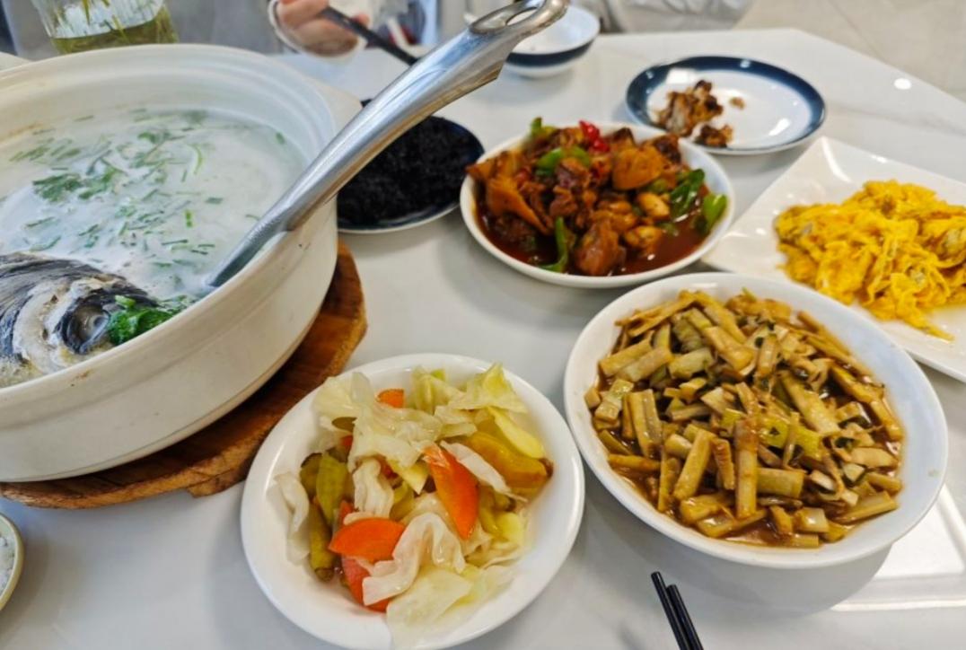几个旅游搭子没一个愿意费脑子规划旅游线路,天目湖自由行攻略只好由我来做了,在网上查了又查,基本确定第一天玩南山竹海景区,然后晚上住到天目湖边的宾馆,第二天去天目湖山水园游玩。 早上8:30从南京出发,不到两个小时就能到达天目湖南山竹海,这个时间点吃饭有点早,所以我们就按计划先去了常州平桥石坝景区,这是亚洲最大的没有钢筋混凝土的纯砖石块垒造的大坝,宽124米,高24米,走上大坝,一侧是平湖,一侧是飞流直下的瀑布,坝上窄窄的一人道让人有点小恐高,但也还有点意思。 游览过平桥石坝,驱车二十几分钟去南山竹海景区门口的饭店吃饭,这顿饭也是做攻略在网上团购的,看这家是五星好评店,就团了388的五人套餐,这个套餐有十道菜,我感觉菜量有点多,跟老板娘商量这一餐拿掉两个菜,等我们去竹海玩过以后回来再吃,老板娘很好说话,同意了,还让我们把车停在饭店门口,这样我们又省了30块两辆车的停车费。 这顿饭吃了好几种天目湖特色美食,砂锅鱼头汤,白芹,黑米饭,雪菜炒竹笋,毛栗子烧肉,农家炒鸡蛋等,还喝了当地的竹叶青茶。 来之前查过天目湖特色菜肴,比较出名的有天目湖砂锅鱼头,扎肝,黑米饭,白芹。我想这两天我们要都安排上。这一餐大家都吃的都很满意,白芹和黑米饭尤其好吃,吃完我们就一起去逛南山竹海了。