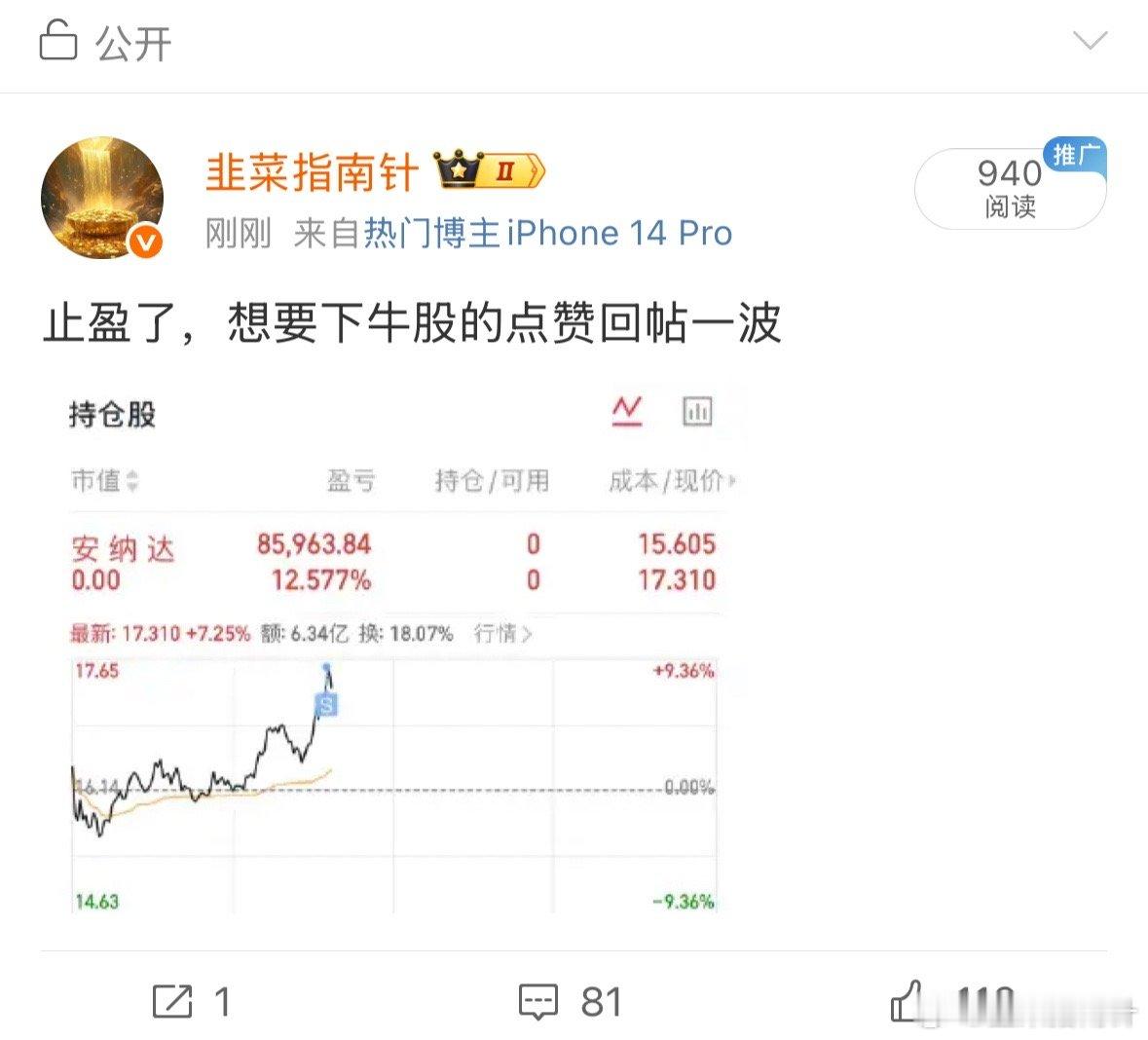 稳健的老铁可以冲高止盈了,收到点赞回帖178