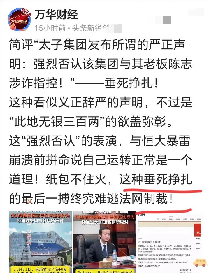 太子集团用中文发布严正声明,其真实目标并不是向美英韩等国家讨回公道。 只能说太子集团抛出的那份中文严正声明,从头到尾都透着股 “醉翁之意不在酒” 的味道,所谓 “驳斥不实指控” 更像是给外界看的幌子。 真正的靶心从来不是冻结了它 150 亿美元比特币的美国,也不是查封了伦敦 19 处房产的英国,更不是扣下 910 亿韩元资产的韩国,而是盯着它国内及香港资产的中国舆论场和监管层。 这波操作简直把“精准碰瓷”玩到了极致,放着制裁国不用对应语言喊话,偏挑中文在国内网络造势,明摆着是对着自己的“救命资产”表忠心。 要知道它海外160多亿美元资产早被美英新韩薅干净,柬埔寨本土银行还挤兑停业,只剩香港40多亿港币房产、两家上市公司和靠中国市场撑着的雪茄生意能救命。 更鸡贼的是蹭反美情绪,把自己包装成霸权受害者,实则想模糊电诈园区骗中国人、害性命的犯罪实质。 拉国际律所站台、借柬埔寨政府表态撑场面,全是为了让国内舆论和监管网开一面,保住最后那点真金白银。 本质就是场“舆论换生机”的算计,用中文声明当烟雾弹,掩盖转移国内资产的真实目的。 你觉得这波舆论操作能让它保住国内资产吗?