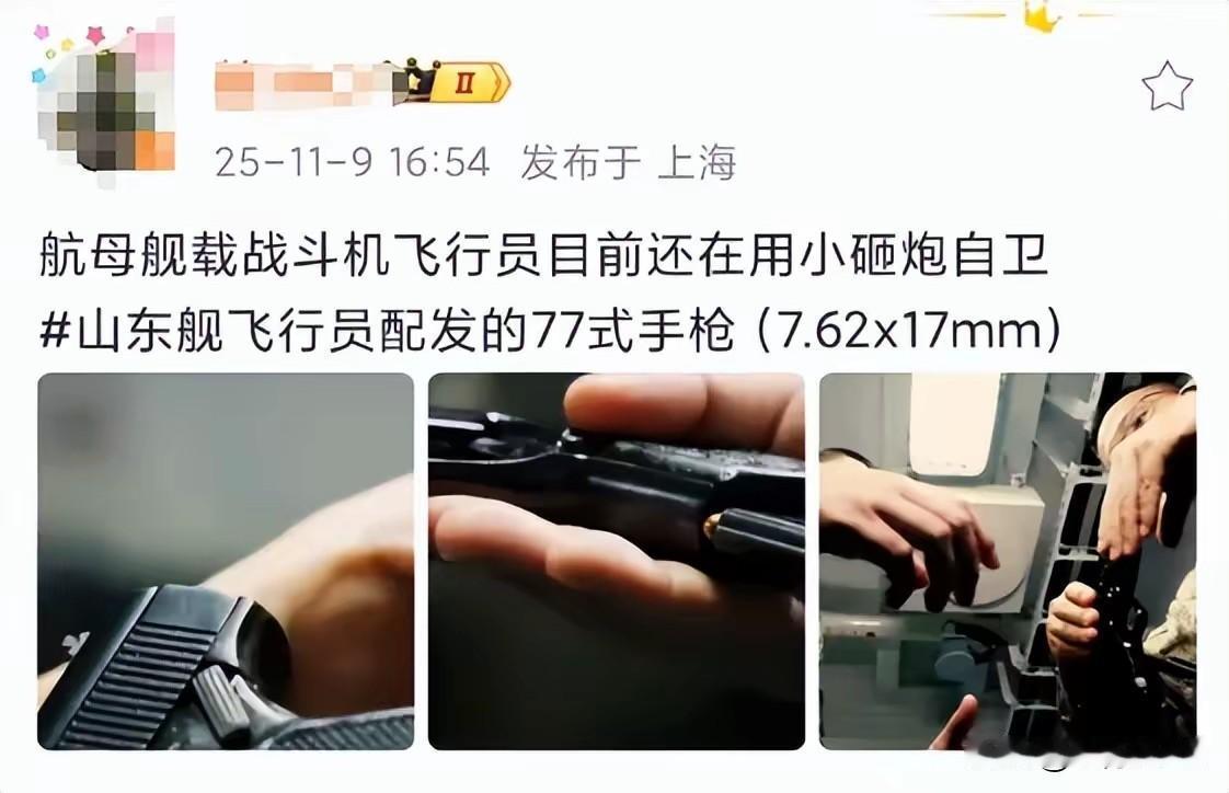 3. 中国山东舰飞行员为何还在用77式手枪:山东舰飞行员用77式手枪的图片来自官方,77式有套筒夹手、走火等缺陷,因舰载机飞行员用枪场景少、海军换装慢;美俄飞行员也带手枪,长枪装弹射座椅,官媒可能用旧素材,说不定已换装。