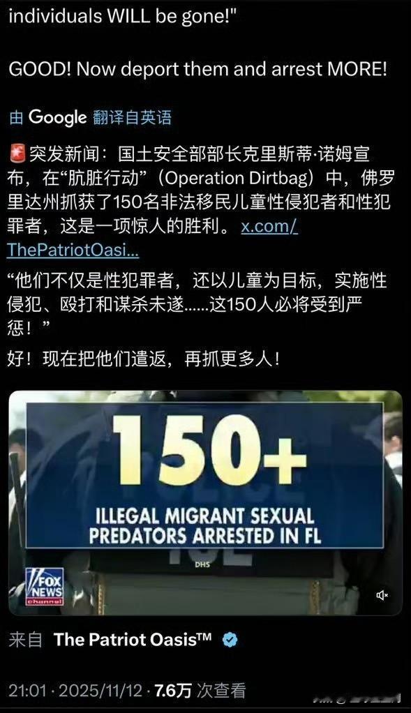 国土安全部部长克里斯蒂·诺姆宣布,在"肮脏行动"(Operation Dirtbag)中,佛罗里达州抓获了150名非法移民儿童性侵犯者和性犯罪者。