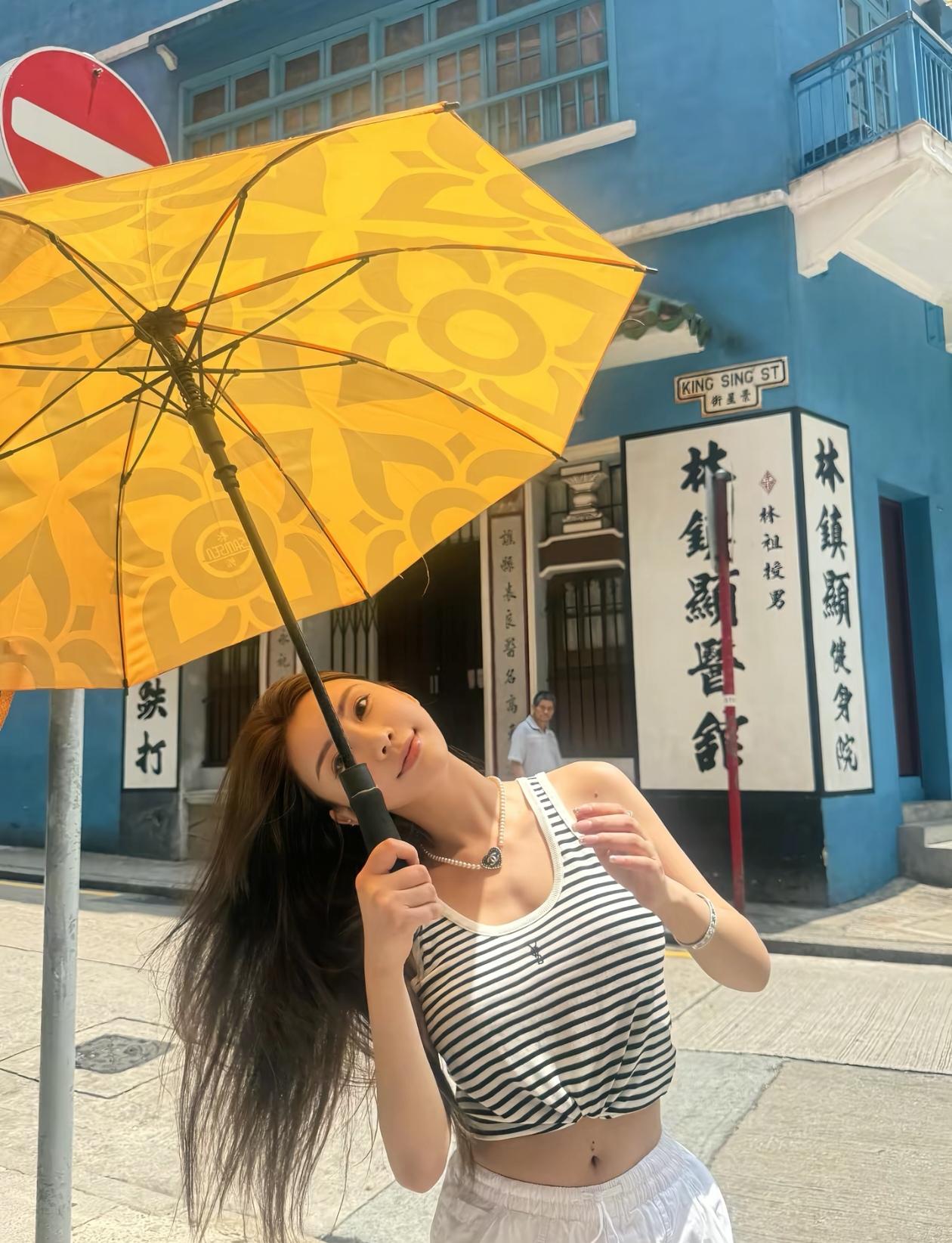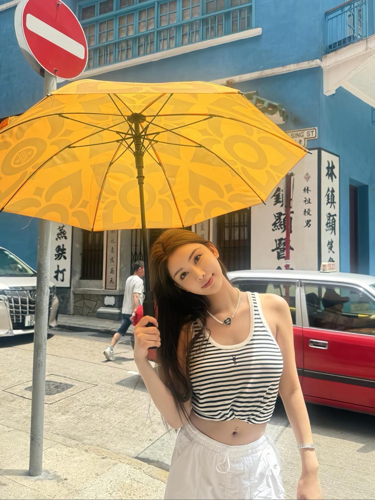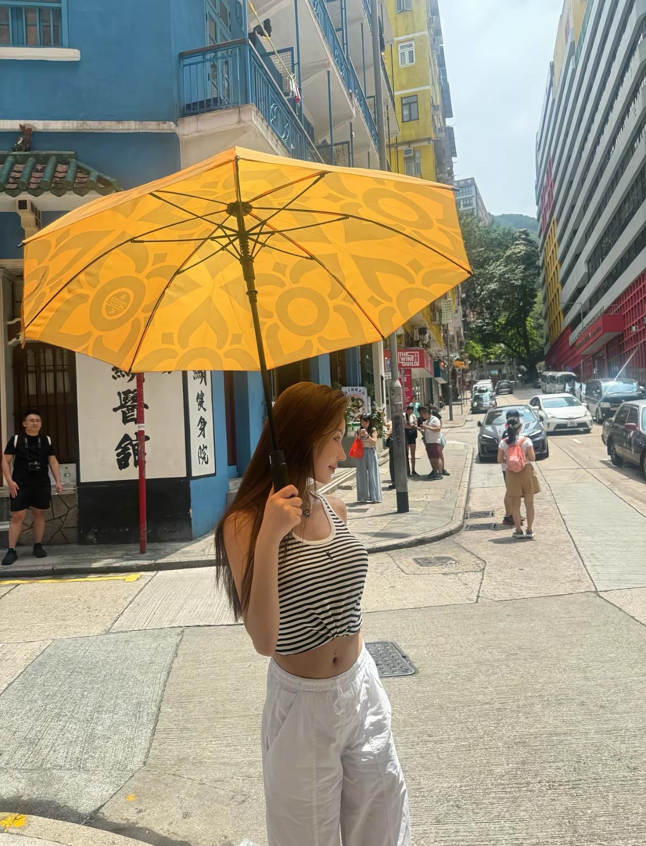 在蓝色街头,撑起一把黄色伞,享受阳光与微风。