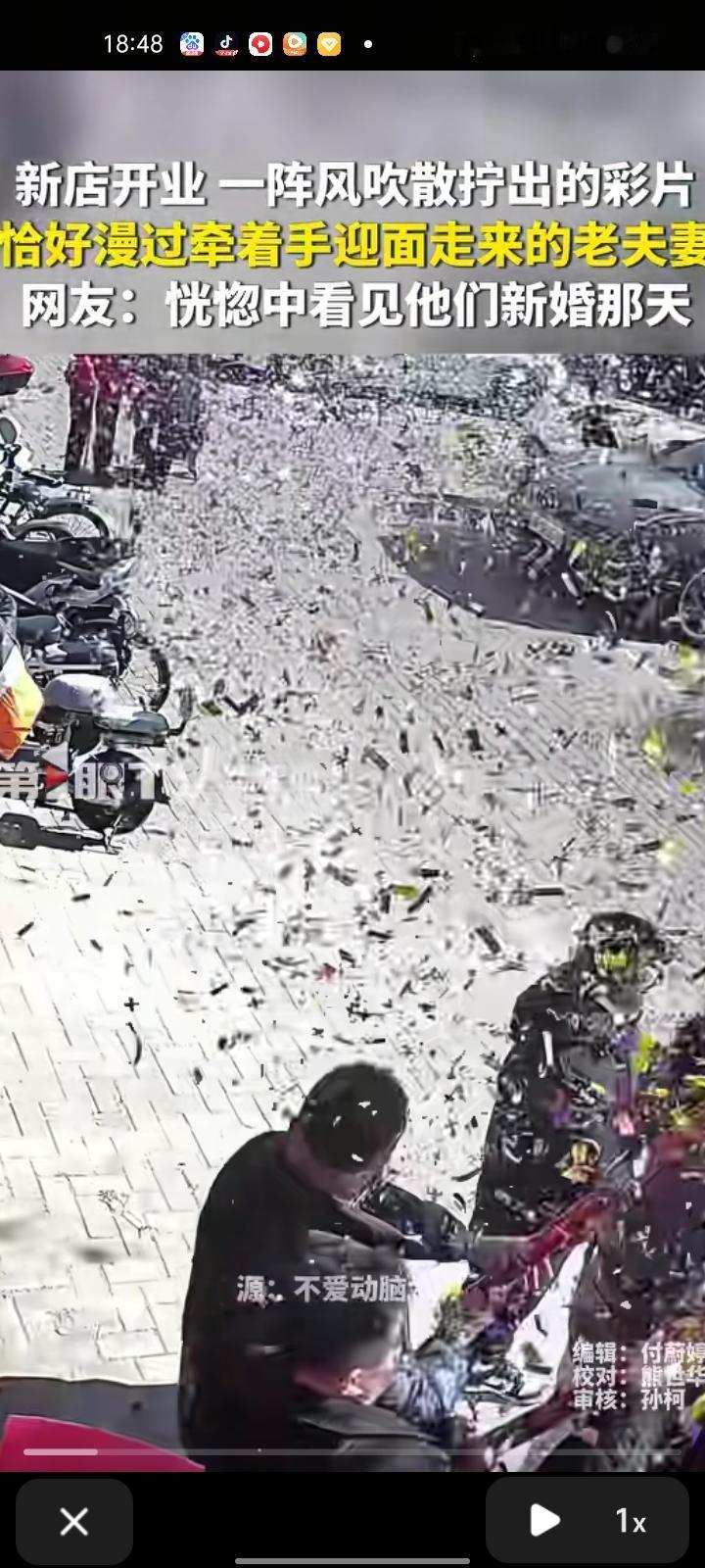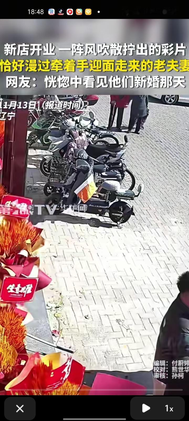 11月3日,辽宁锦州。网友发布一段暖心视频,一家新店开业时,一对老夫妻正巧路过一旁静静等候。当彩带筒拧开,纷飞的彩带正好吹向他们。老夫妻面对飘来的“彩带雨”,脸上洋溢着笑容,不躲不闪,缓缓向前走去。