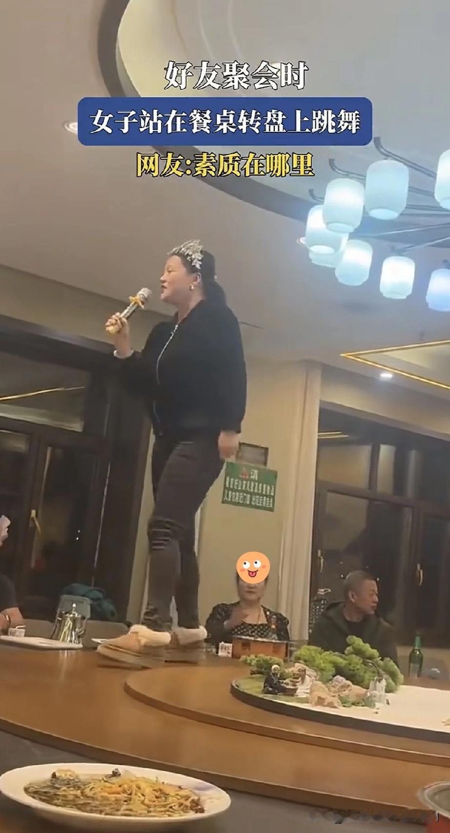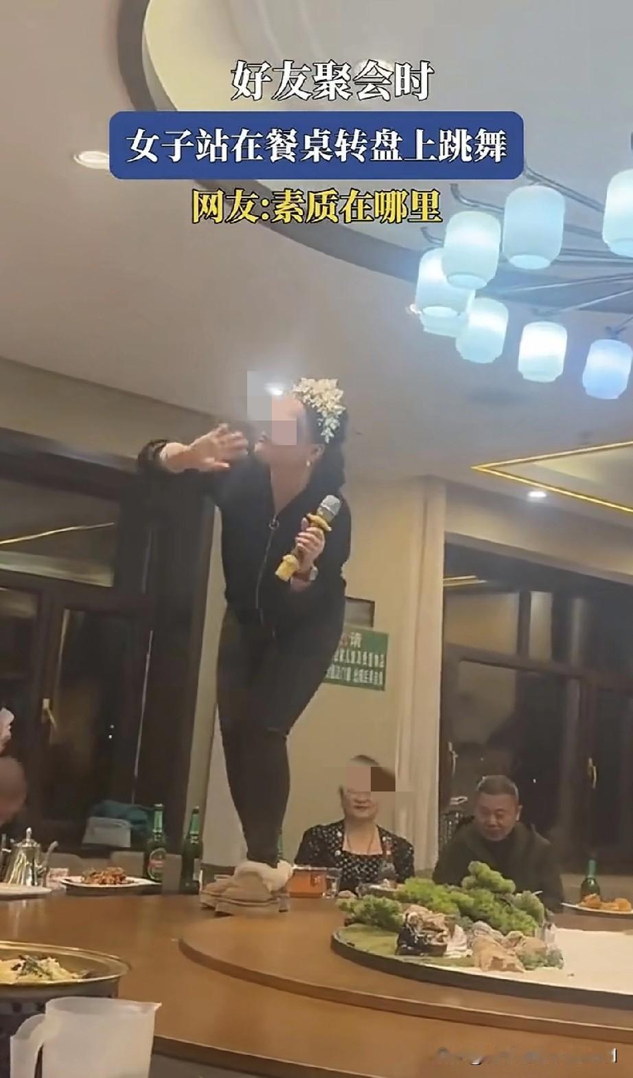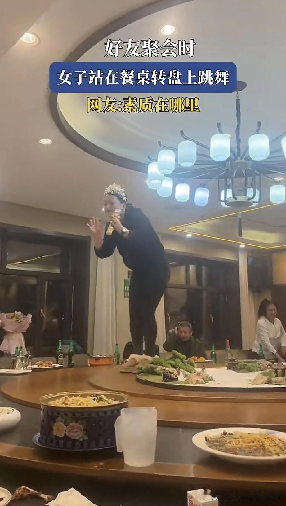好友聚会时,一名女子竟跳上餐桌转盘唱歌,满桌的人都尴尬不已。她自觉很美,还跳上舞蹈,穿着鞋子就踩在了吃饭的桌上,实在是没品至极。后面的阿姨明显流露出嫌弃的神情。 我就想问在座各位,她在桌子上搔首弄姿,而且脚边前后都已摆满了菜,这顿饭你们还吃得下去吗? 同桌的人看着都反感,估计是熟人家里的不懂事大孩子,大家只能碍于素质、涵养和教养忍着。这到底是父母没教好,还是老师没教好呢?要是我,肯定第一时间就走人,谁爱吃谁吃。