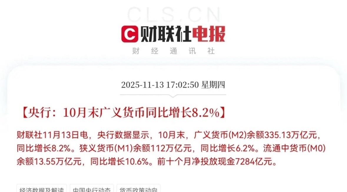 央行发布了10月份的金融数据,社会融资规模存量437.72亿,同比增长8.5%,M2余额335.13万亿,同比增长8.2%,M1余额112万亿,同比增长6.2%,M0余额13.55万亿,同比增长10.6%,M2代表着货币的供应量,相对于当前5%左右的GDP增长速度,M2增长超8%,意味着市场流动性是合理充裕的,同是M1-M2剪刀差也在持续收窄,反映了企业生产经营正在稳步上升,个人投资消费需求也正在回暖,表明整个经济正在有序复苏,这是重大利好数据当前A股市场流动性充裕,估值水平合理,叠加消费复苏,三重利好刺激下,明日有望迎来起飞了!